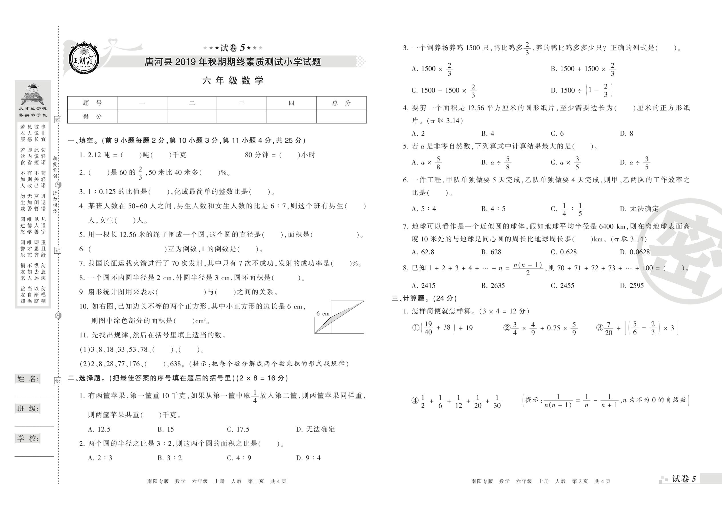2019-2020学年第一学期南阳市唐河县六年级数学试卷(人教版)【5】