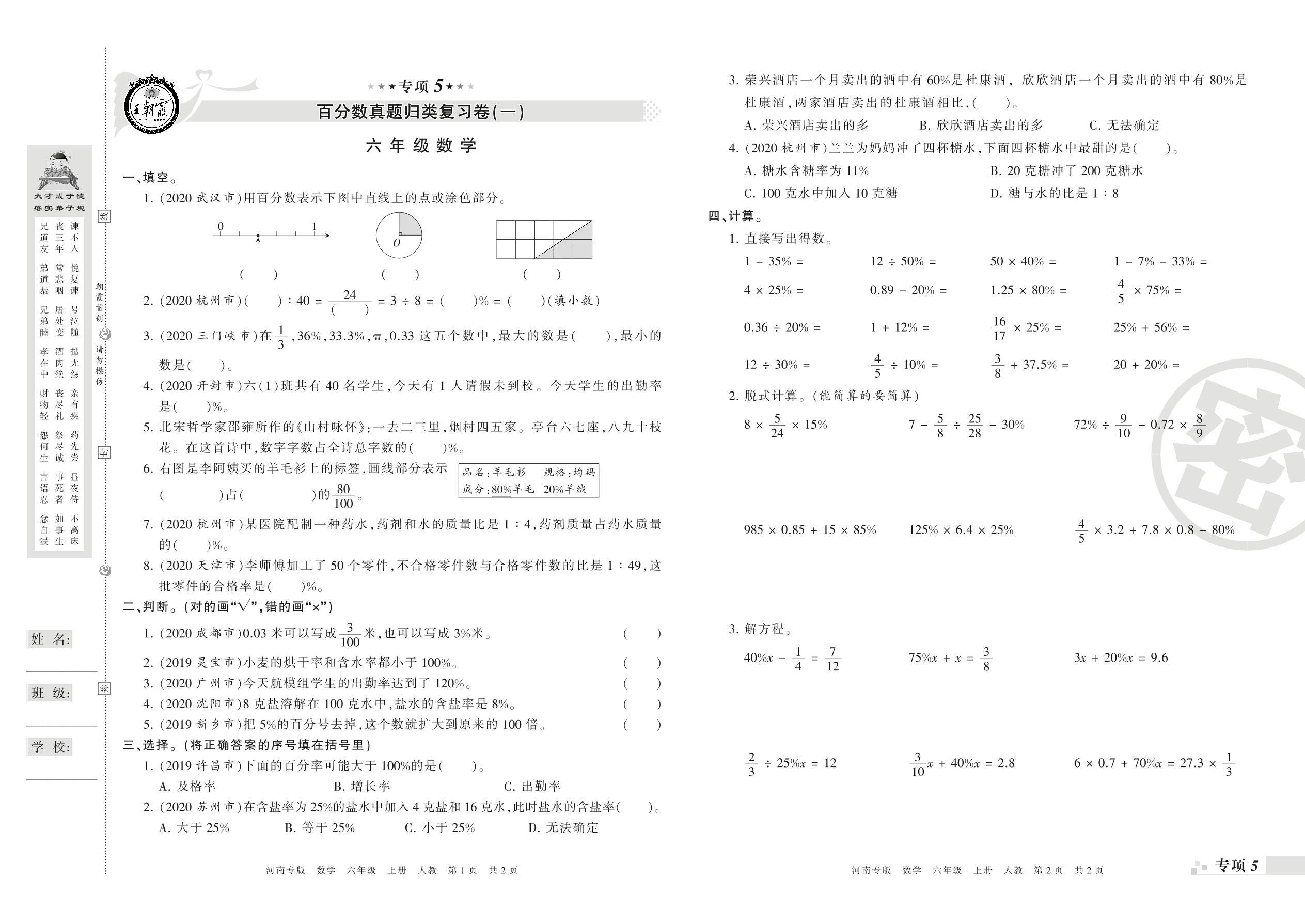 王朝霞期末专项卷——百分数真题归类复习六年级上册数学(人教版)【0】