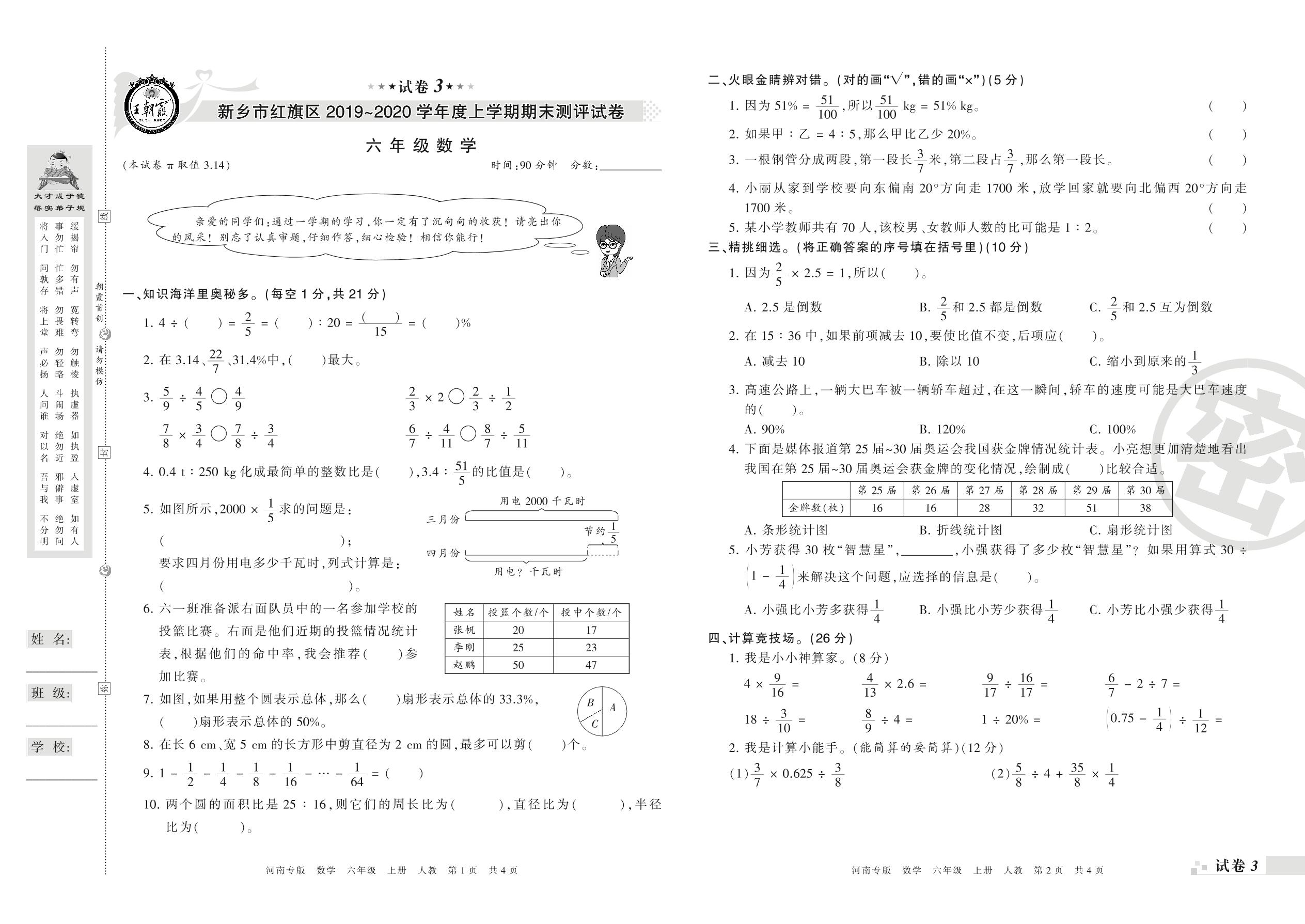2019-2020学年第一学期新乡市红旗区六年级数学试卷(人教版)【3】