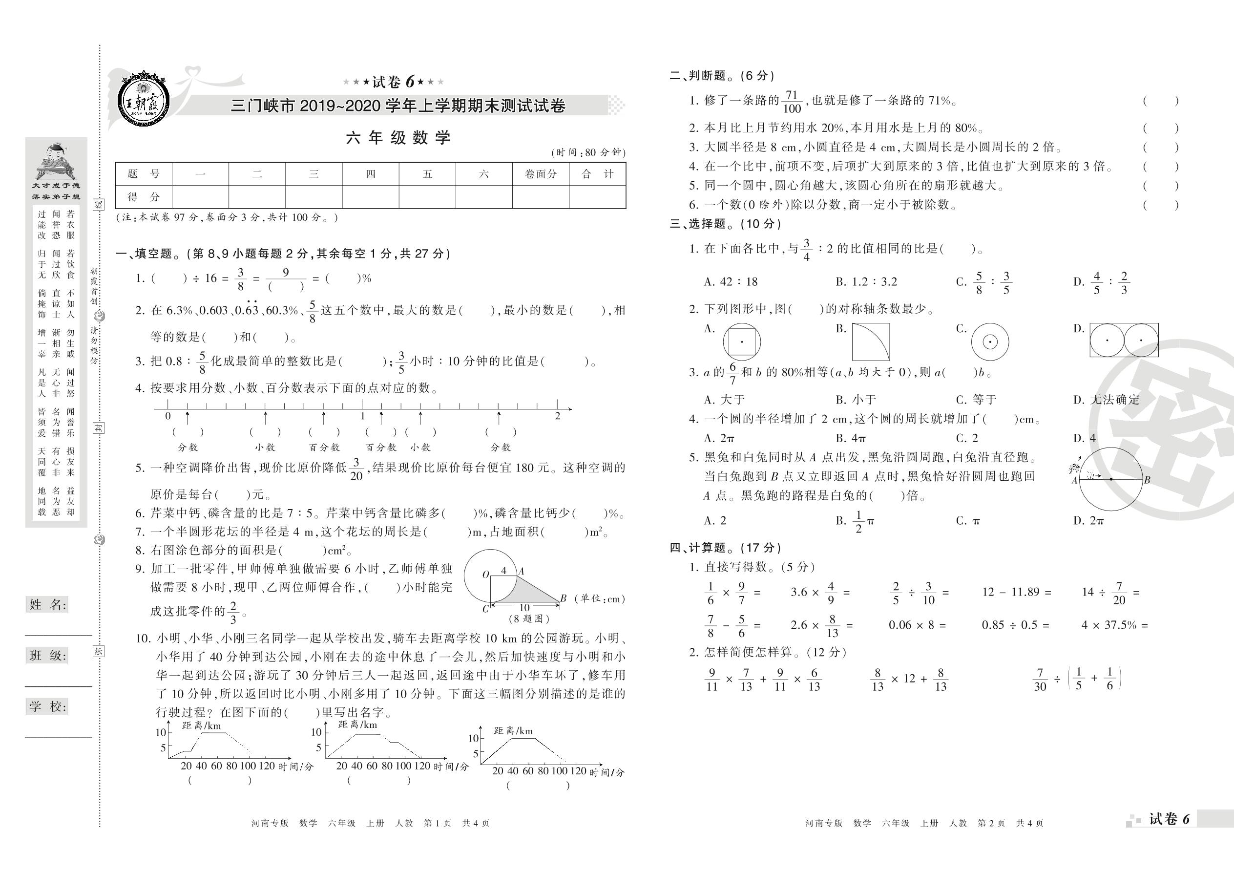 2019-2020学年第一学期三门峡市六年级数学试卷(人教版)【6】