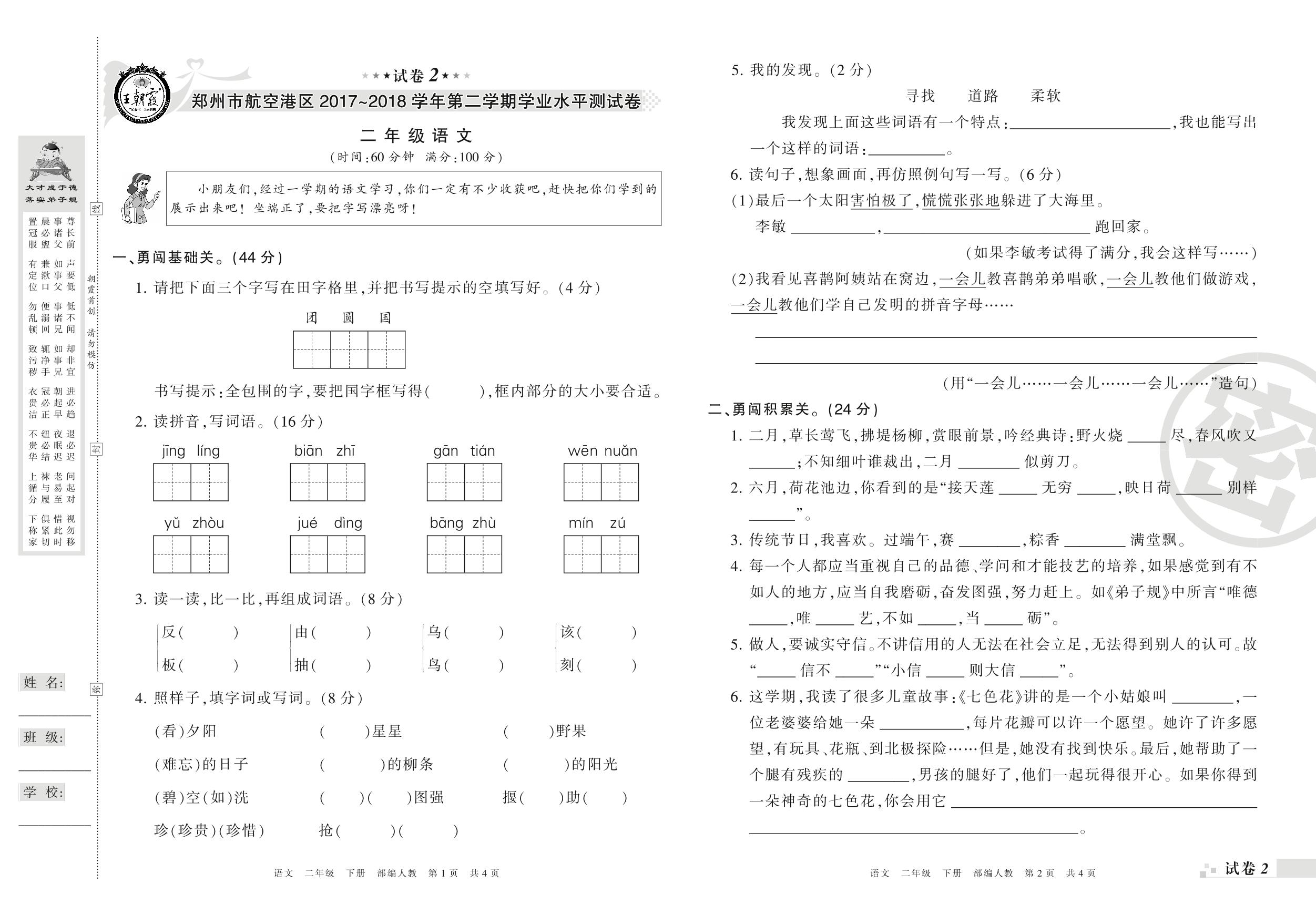 2017-2018学年第二学期郑州市航空港区二年级语文试卷(人教版)【2】