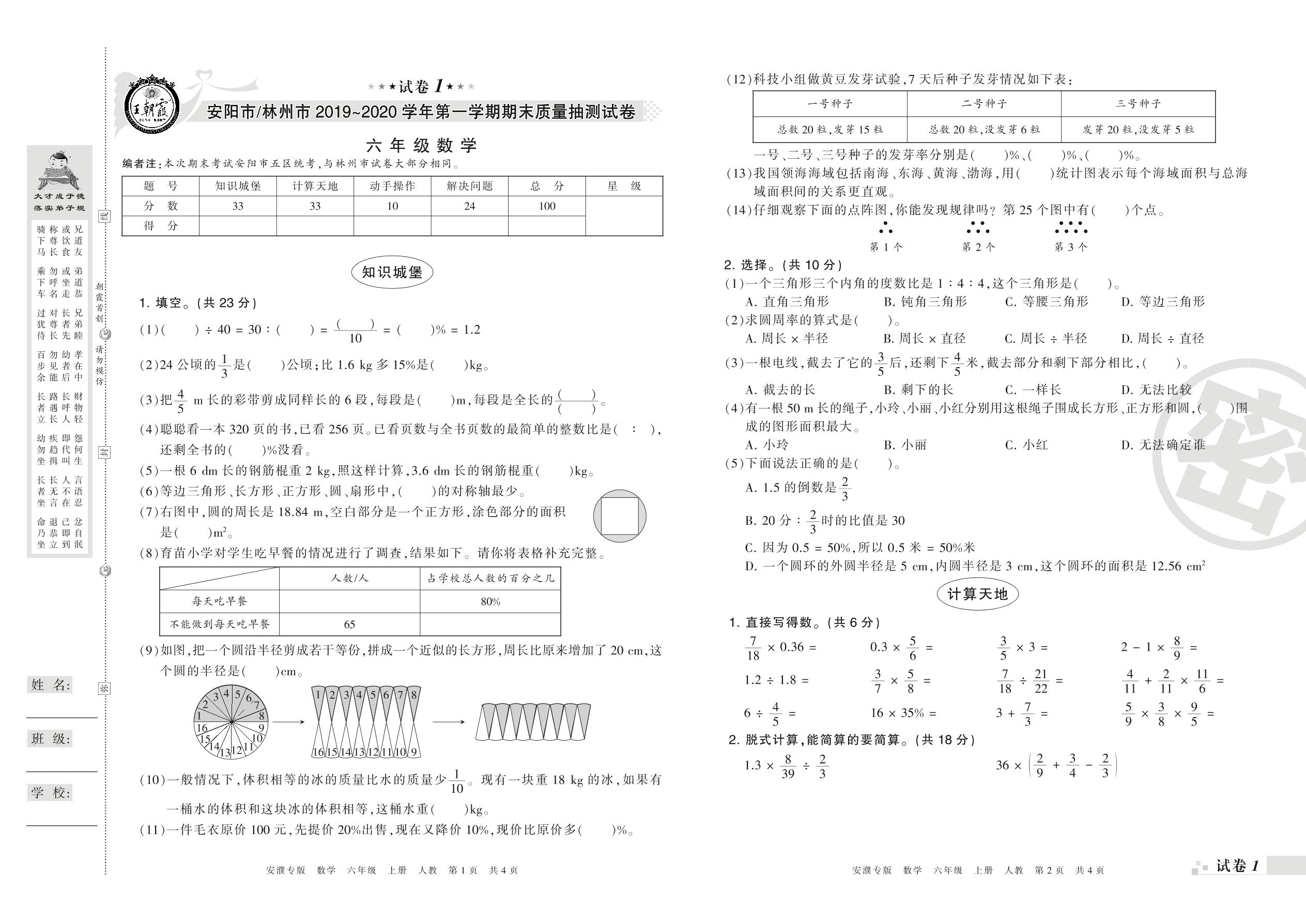 2019-2020学年第一学期安阳市、林州市六年级数学试卷(人教版)【1】