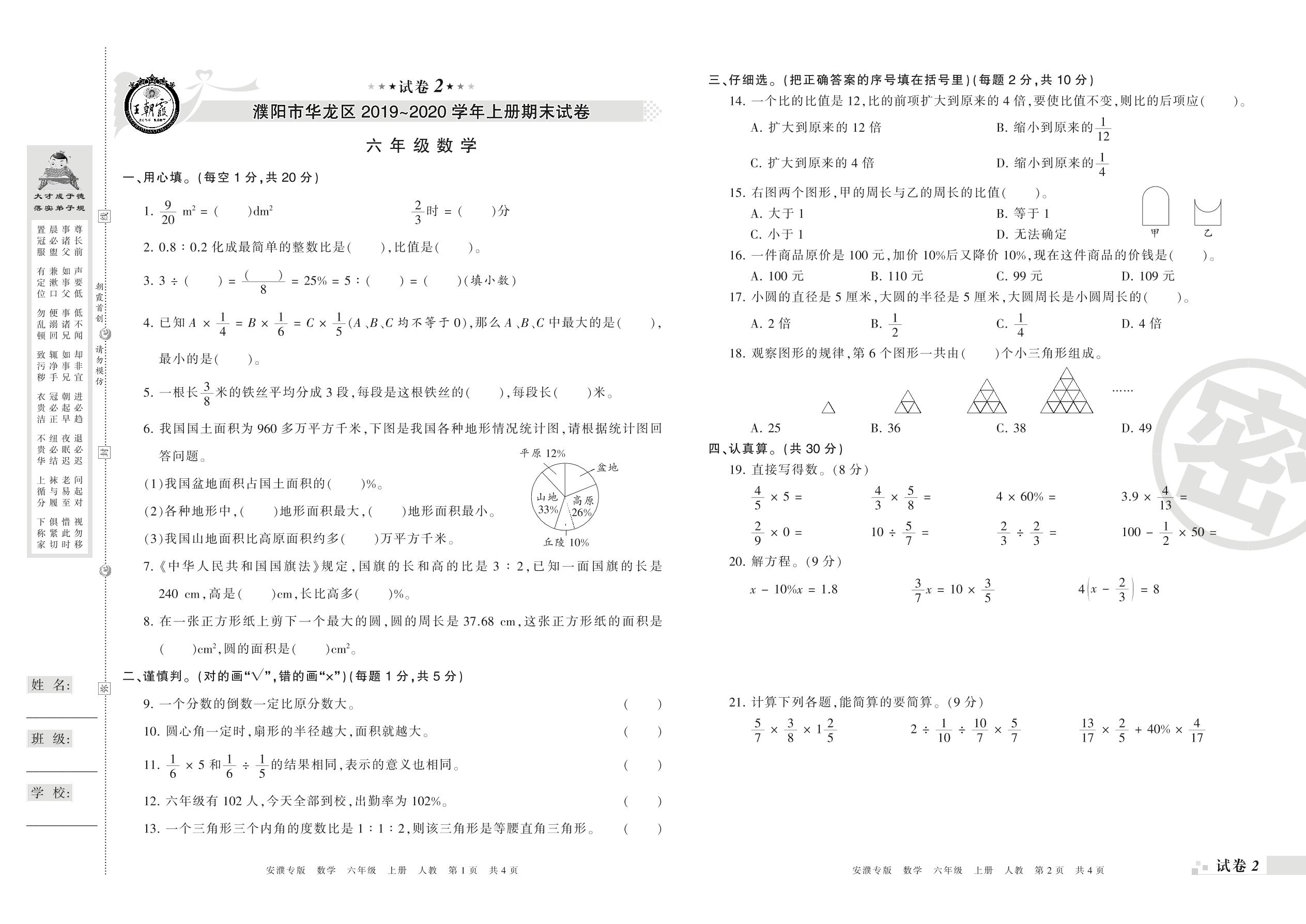 2019-2020学年第一学期濮阳市华龙区六年级数学试卷(人教版)【2】