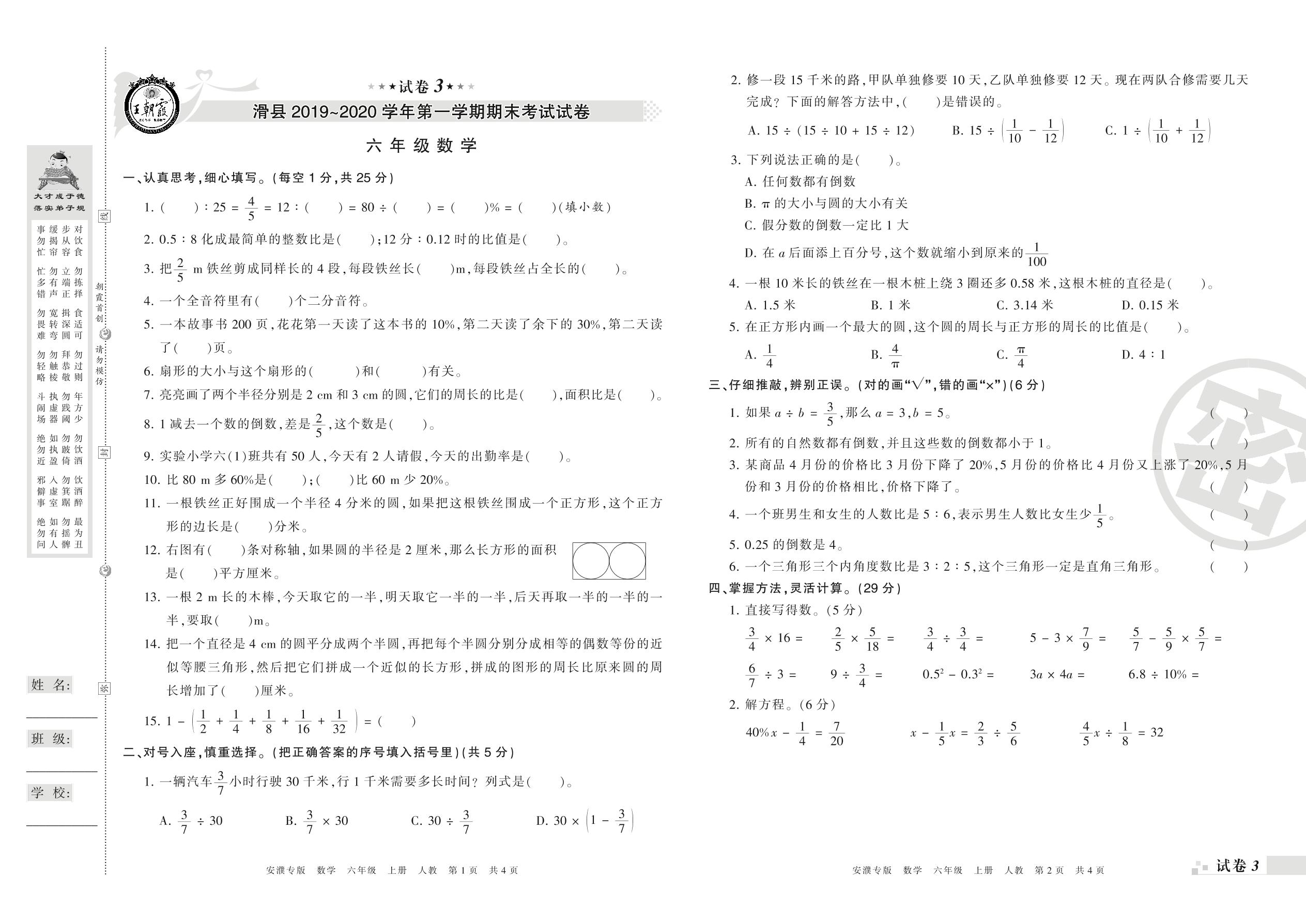 2019-2020学年第一学期安阳市滑县六年级数学试卷(人教版)【3】