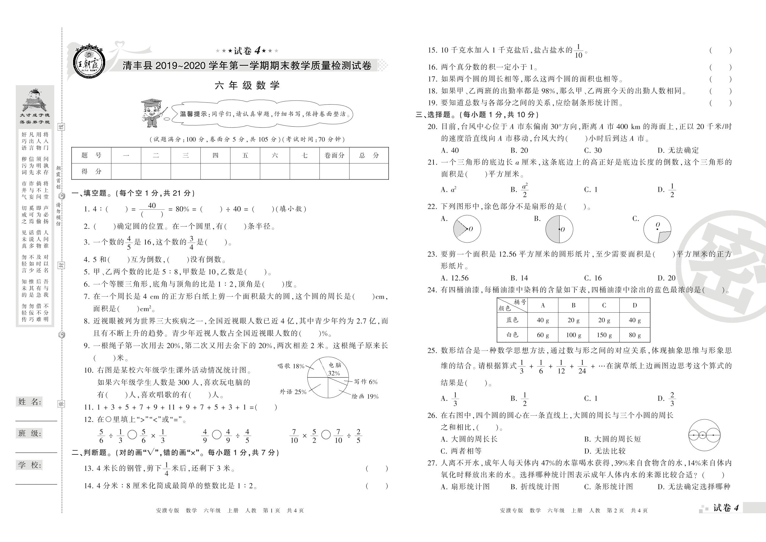 2019-2020学年第一学期濮阳市清丰县六年级数学试卷(人教版)【4】