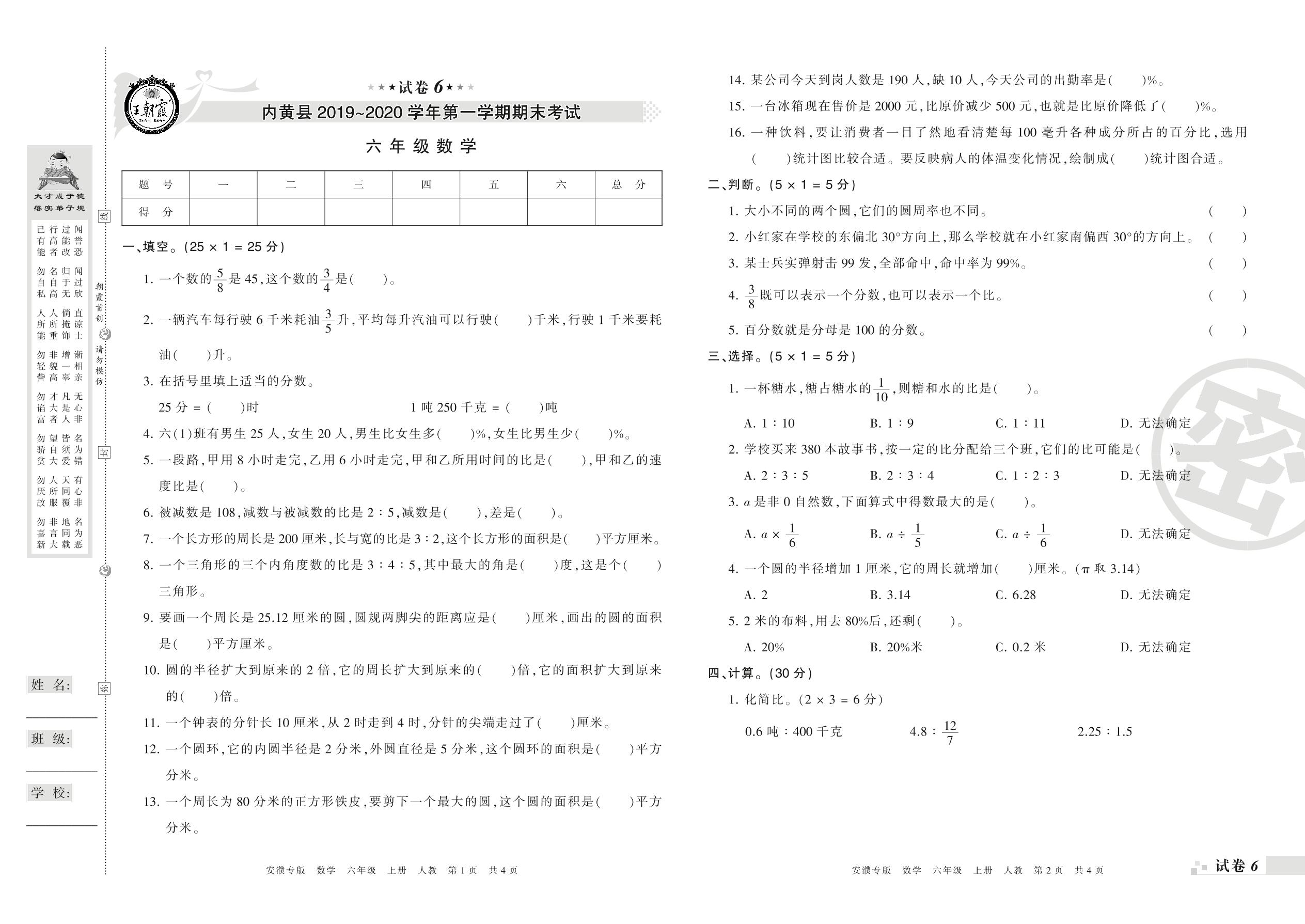 2019-2020学年第一学期安阳市内黄县六年级数学试卷(人教版)【6】