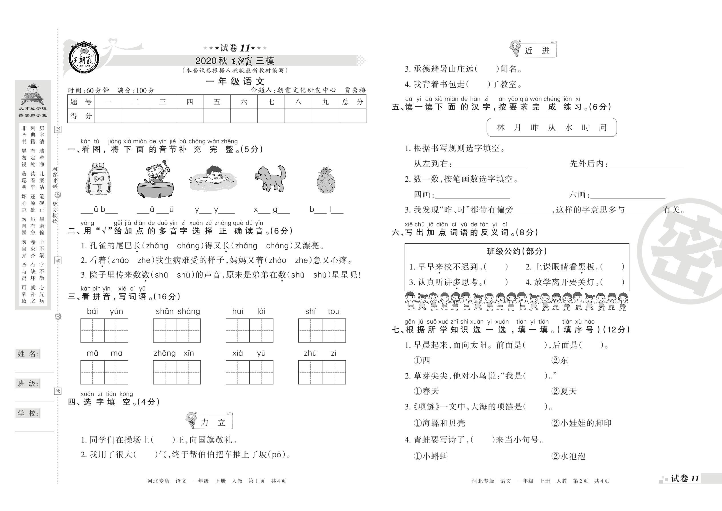 王朝霞期末模拟卷一年级上册语文(人教版)_R210731174110【11】