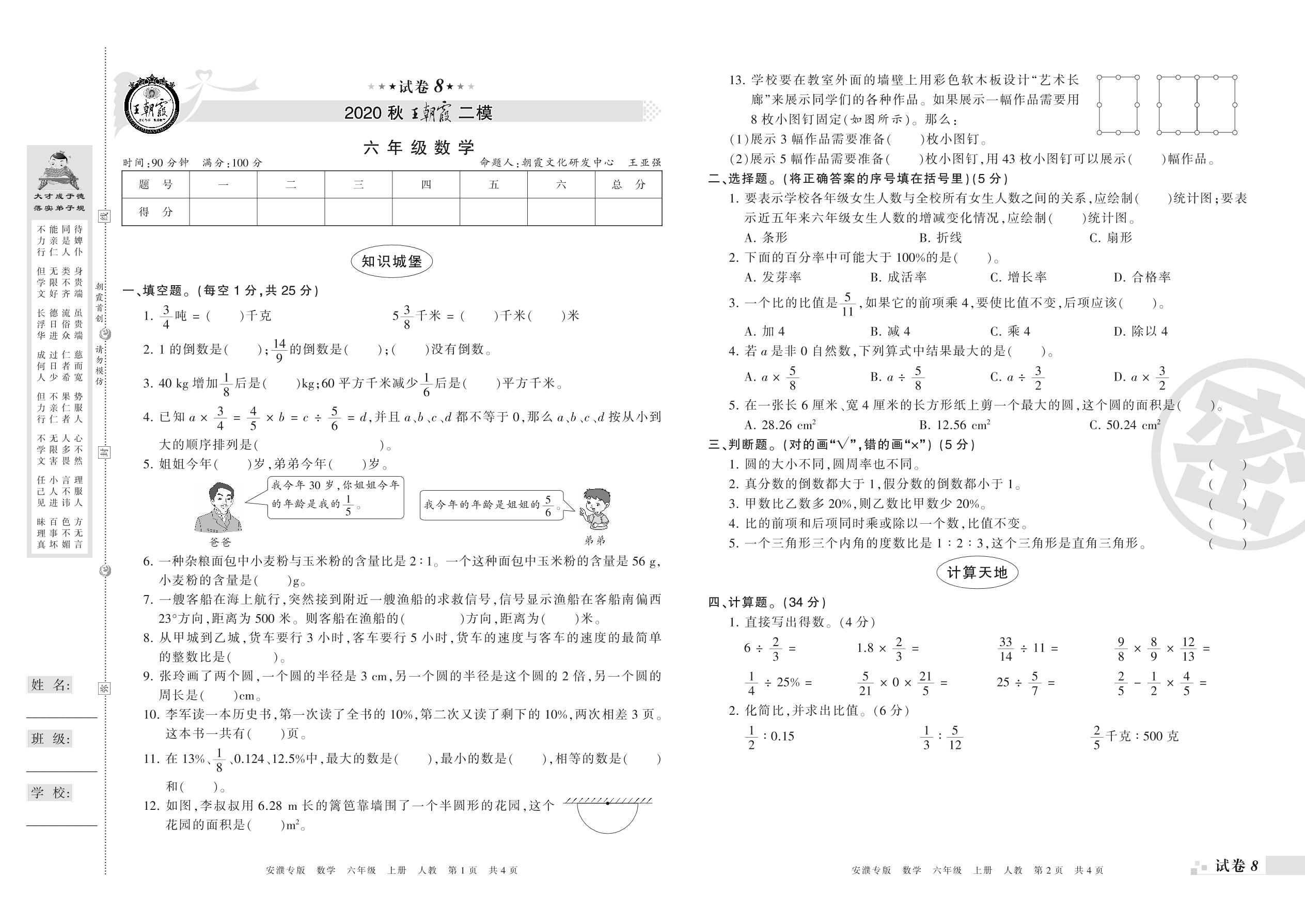 王朝霞期末模拟卷六年级上册数学(人教版)_R21080592022【8】