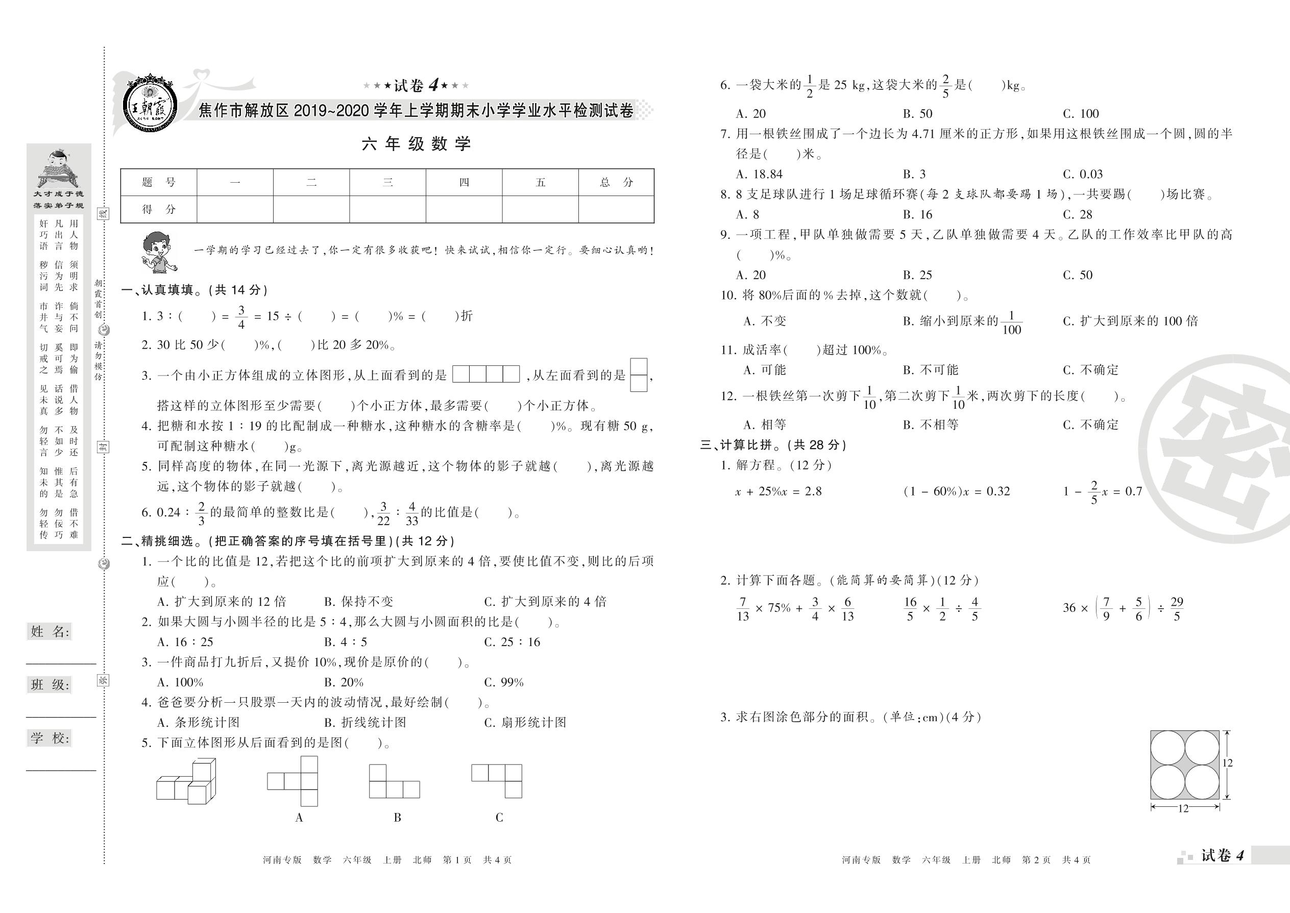 2019-2020学年第一学期焦作市解放区六年级数学试卷(北师版)【4】