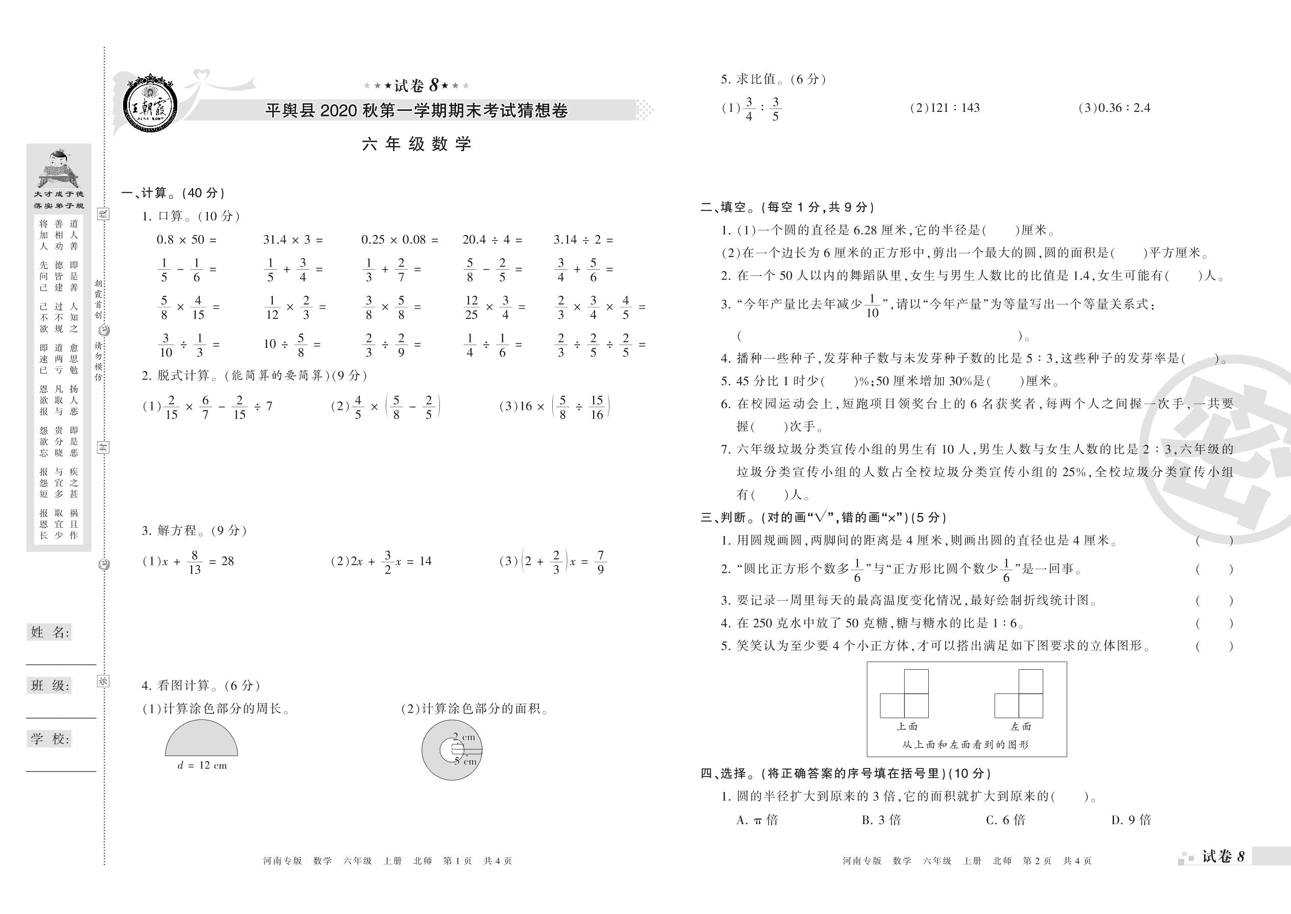 2019-2020学年第一学期驻马店市平舆县猜想卷六年级数学试卷(北师版)【8】