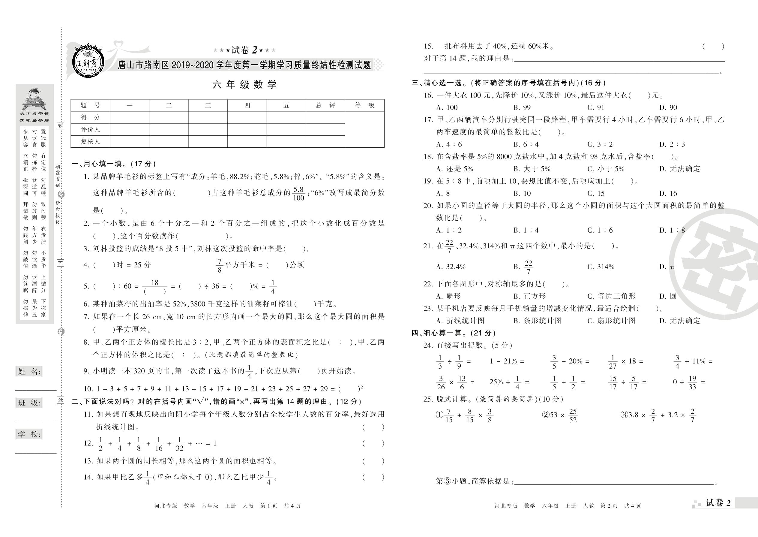 2019-2020学年第一学期唐山市路南区六年级数学试卷(人教版)【2】