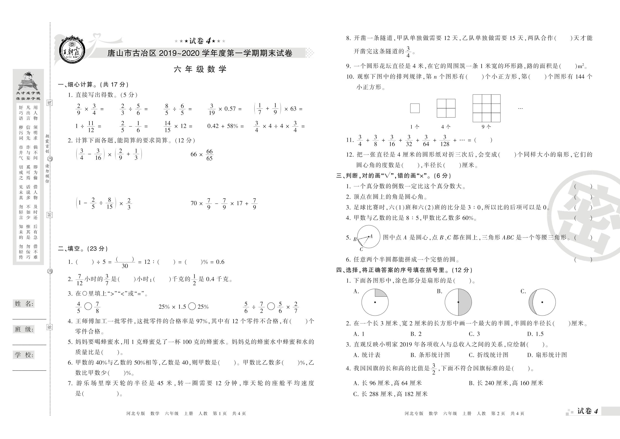2019-2020学年第一学期唐山市古冶区六年级数学试卷(人教版)【4】