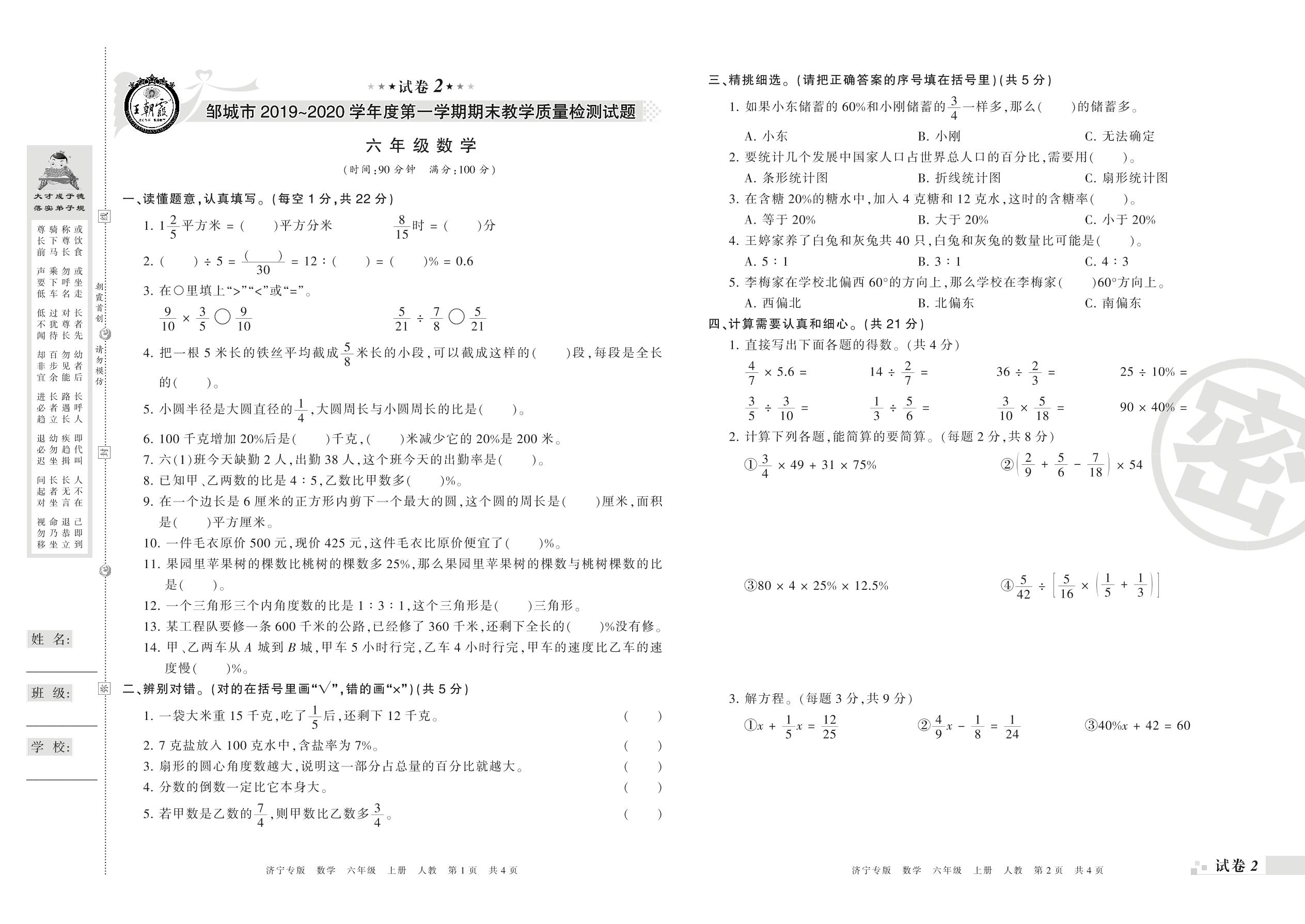2019-2020学年第一学期邹城市六年级数学试卷(人教版)【2】
