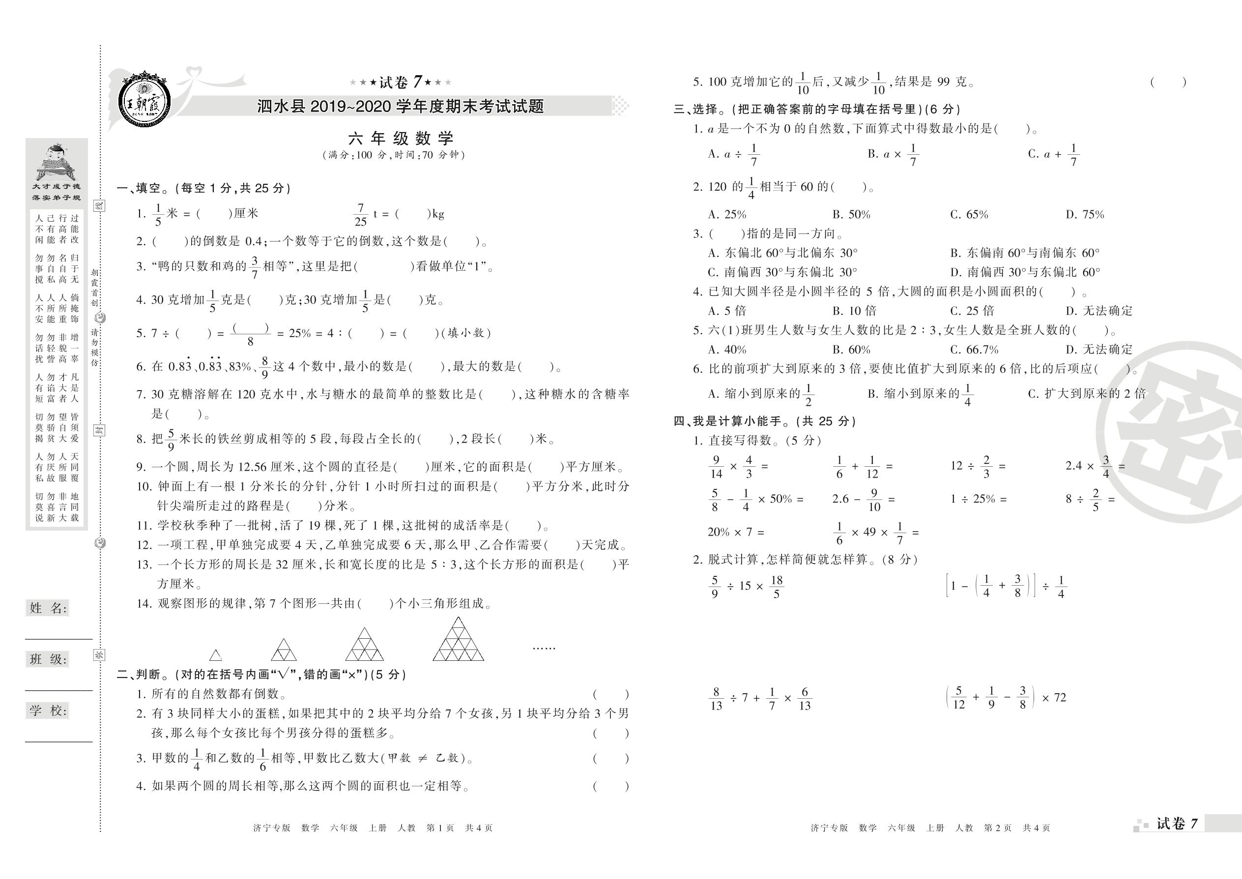 2019-2020学年第一学期济宁市泗水县六年级数学试卷(人教版)【7】