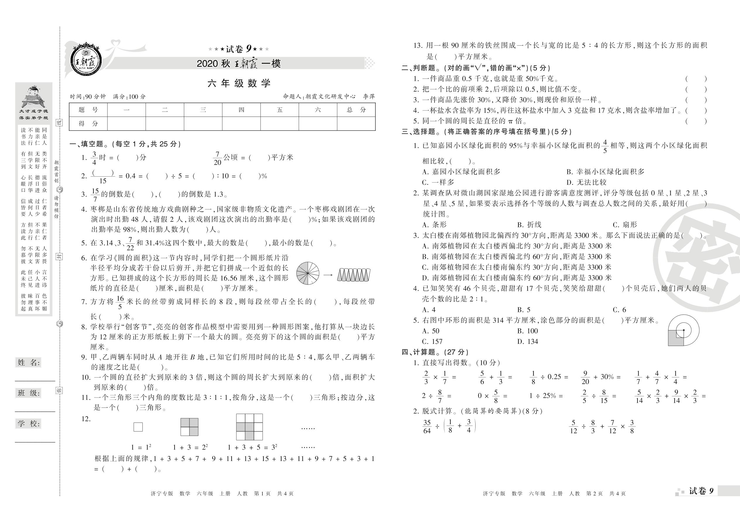 王朝霞期末模拟卷六年级上册数学(人教版)_R21080592252【9】