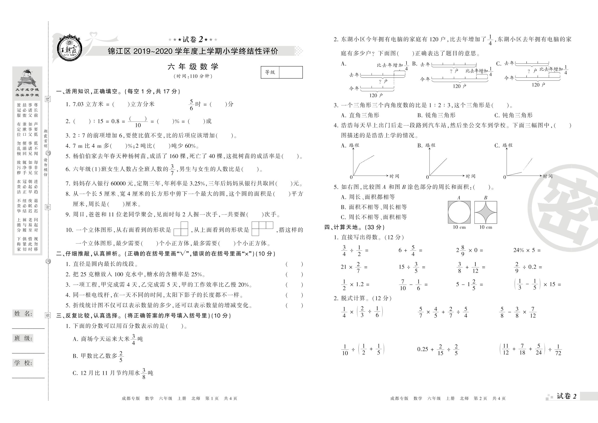 2019-2020学年第一学期成都市锦江区六年级数学试卷(北师版)【2】