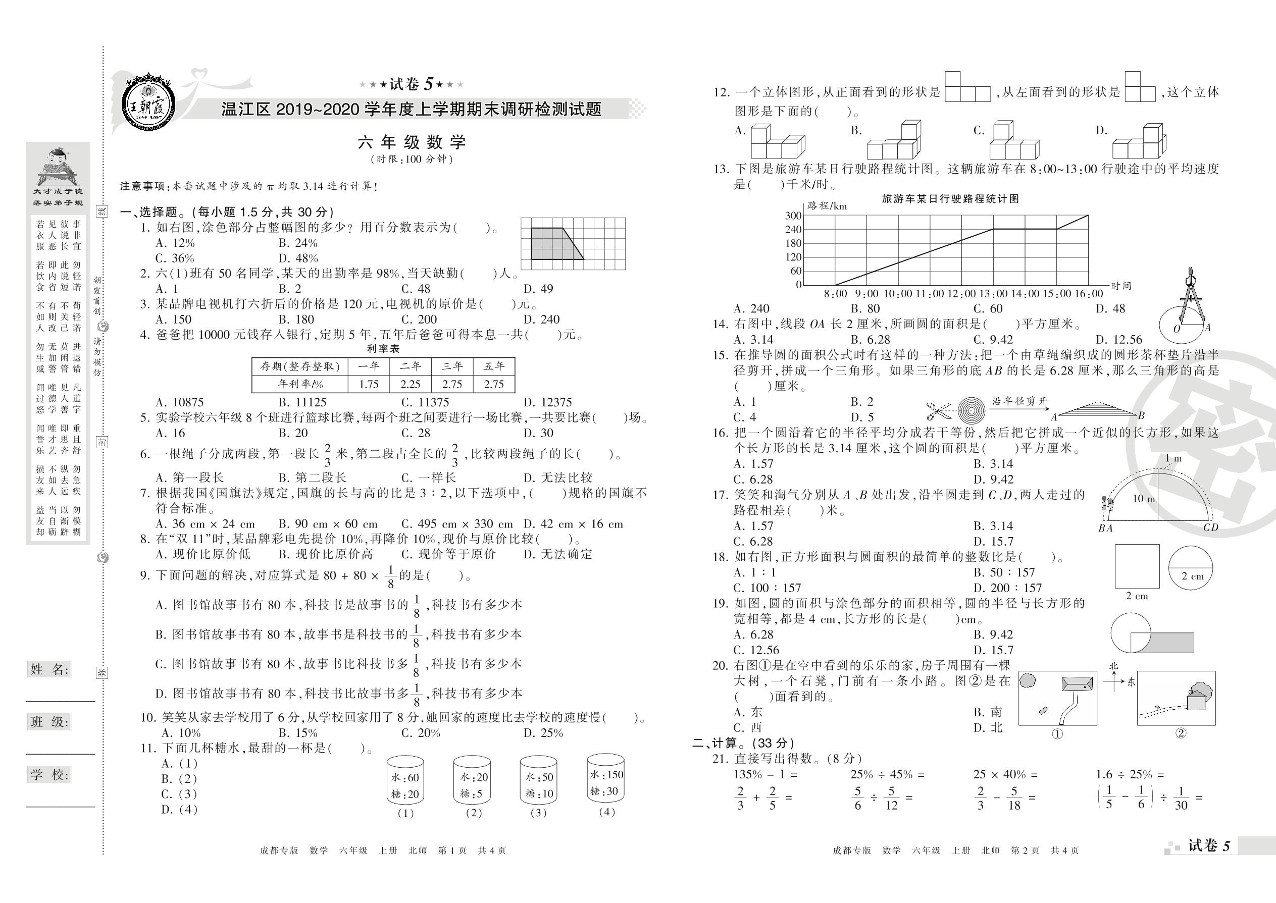 2019-2020学年第一学期成都市温江区六年级数学试卷(北师版)【5】