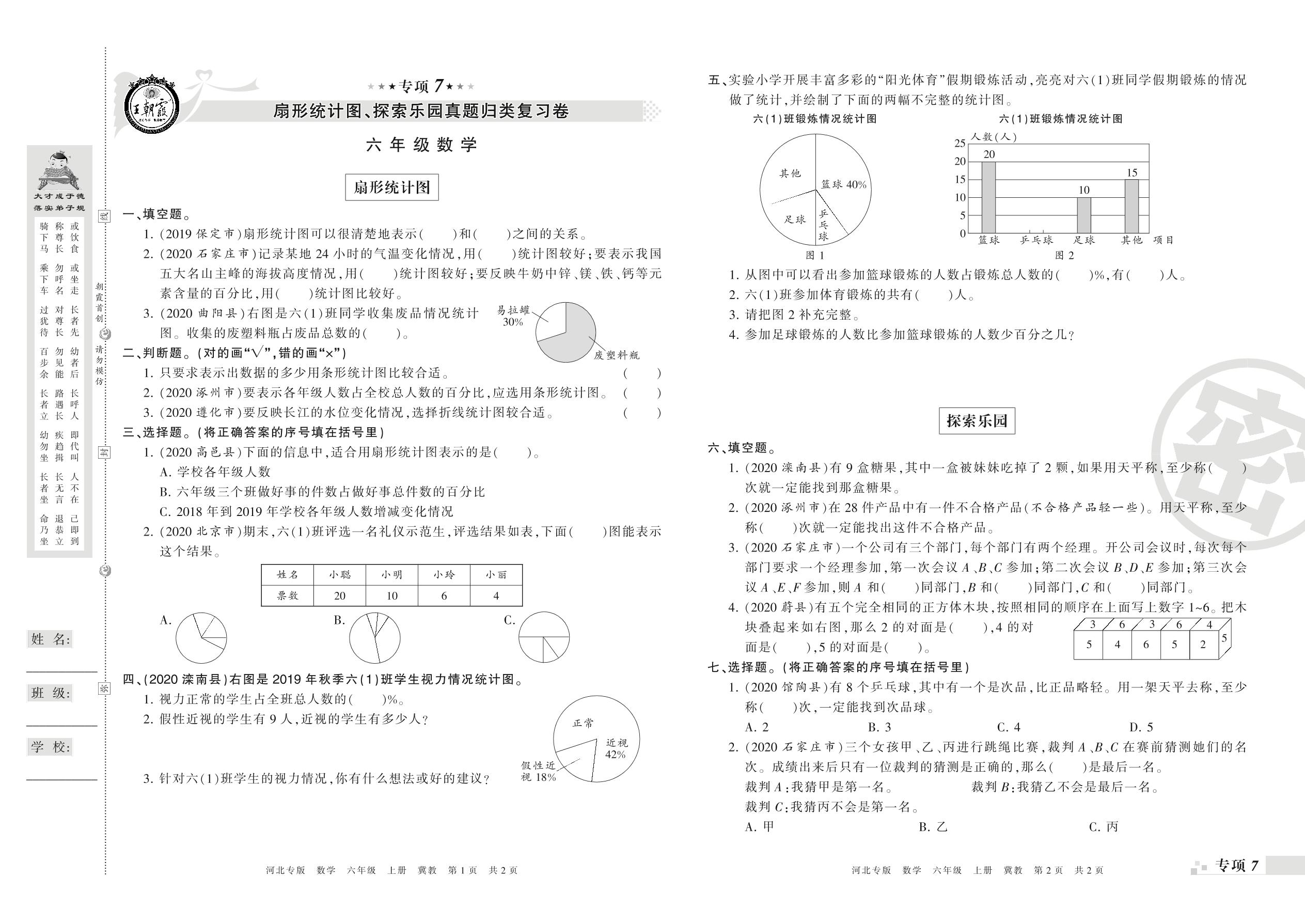 王朝霞期末专项卷——扇形统计图、探索乐园真题归类复习、新颖题速递:生活与数学六年级上册数学(冀教版)【0】