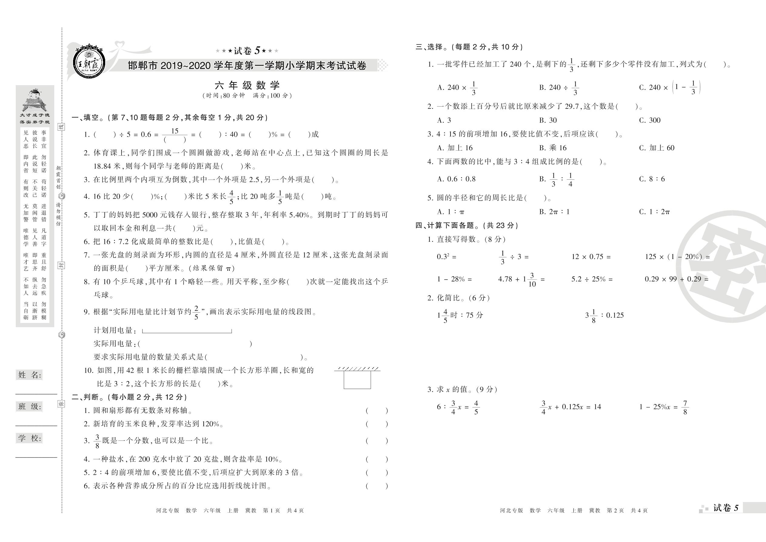 2019-2020学年第一学期邯郸市六年级数学试卷(冀教版)【5】