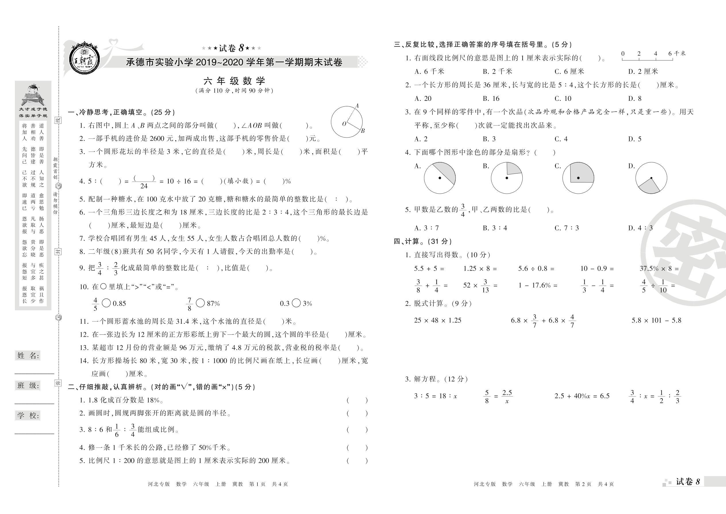 2019-2020学年第一学期承德市实验小学六年级数学试卷(冀教版)【8】