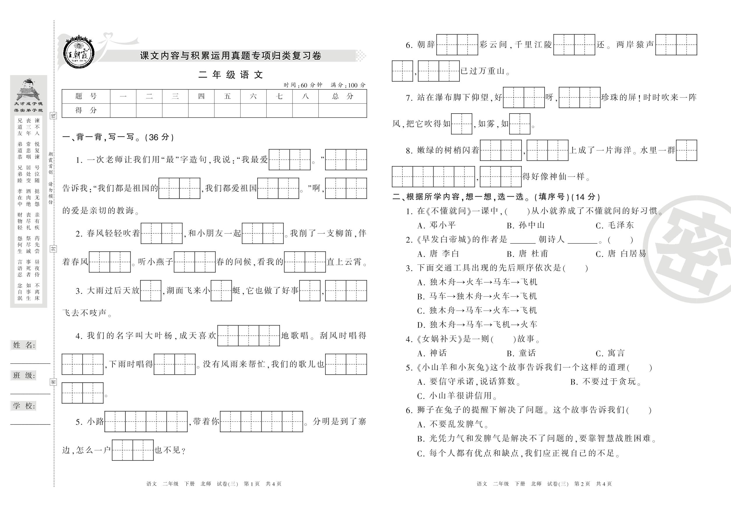 王朝霞期末专项卷二年级下册语文(北师版)_R21080172126【3】