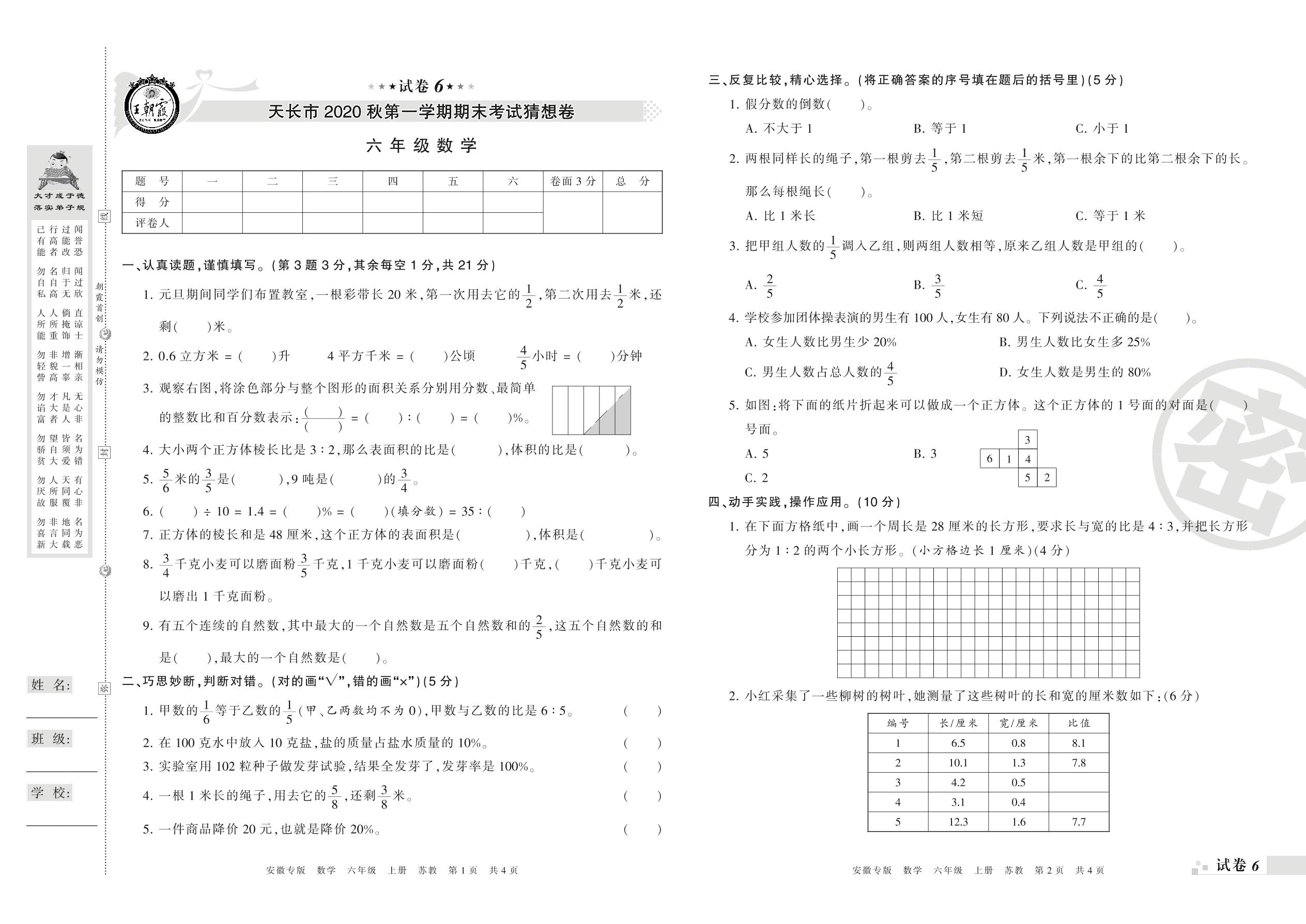 2019-2020学年第一学期天长市六年级数学试卷(苏教版)【6】