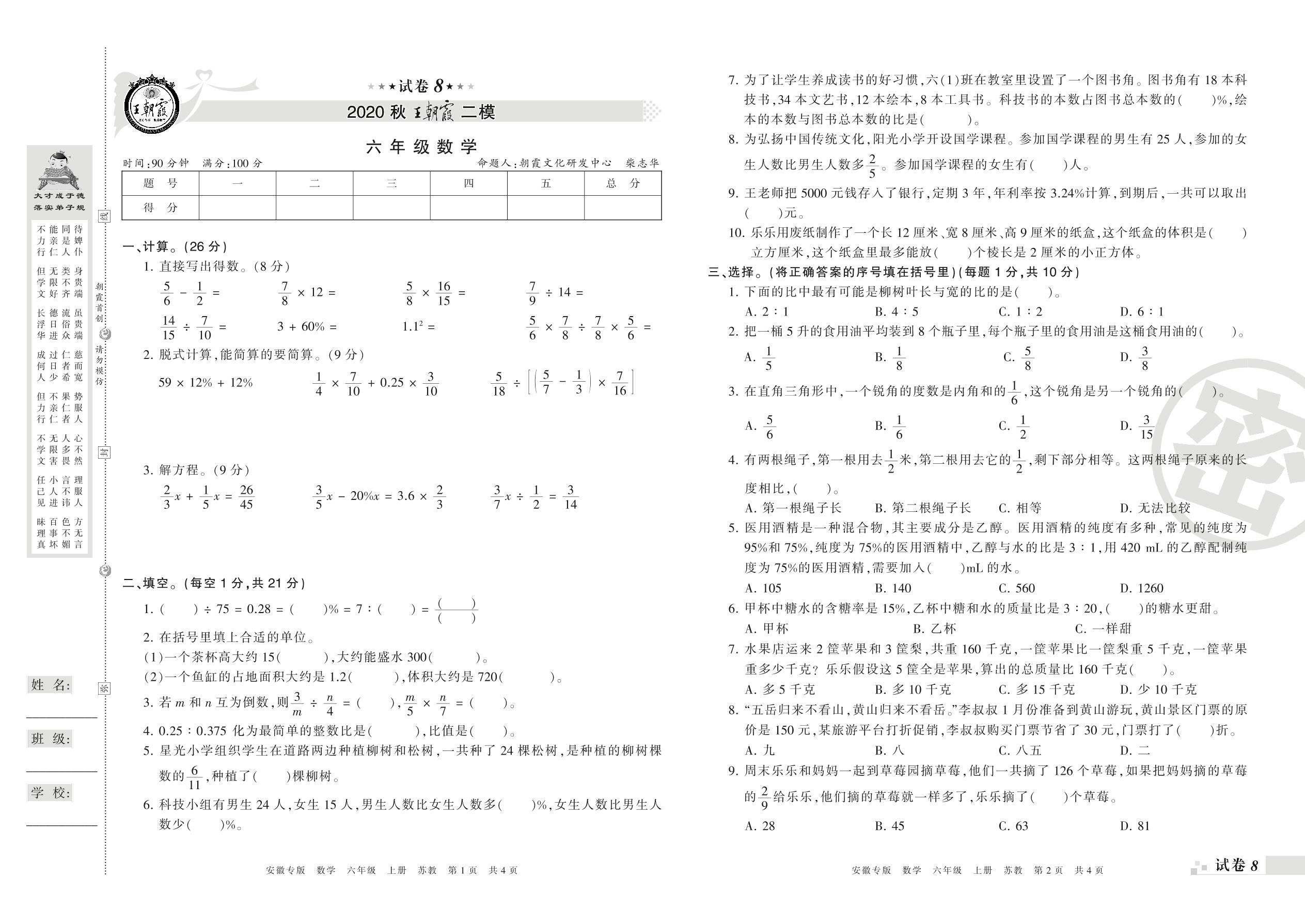 王朝霞期末模拟卷六年级上册数学(苏教版)_R21080592543【8】