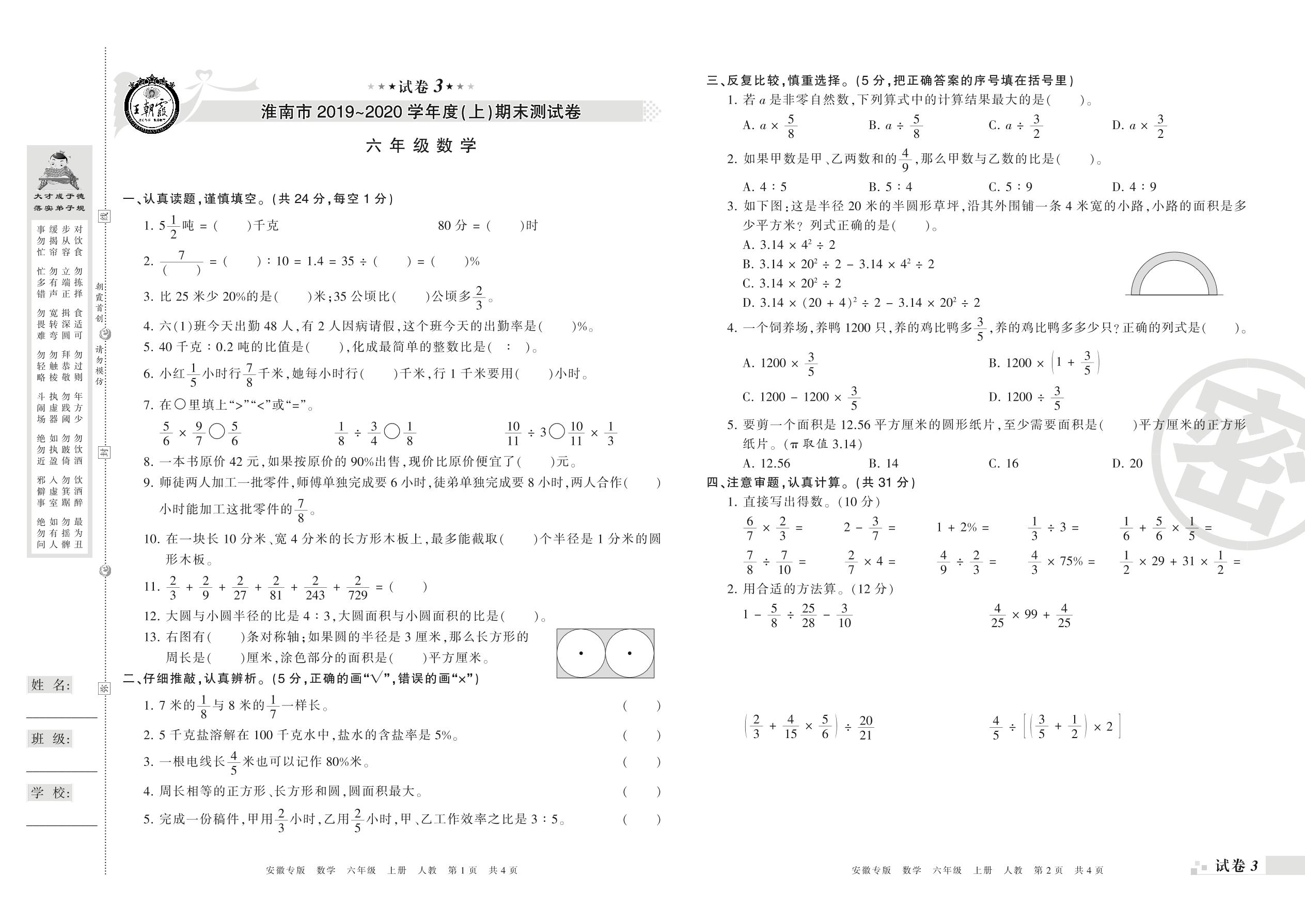 2019-2020学年第一学期淮南市六年级数学试卷(人教版)【3】