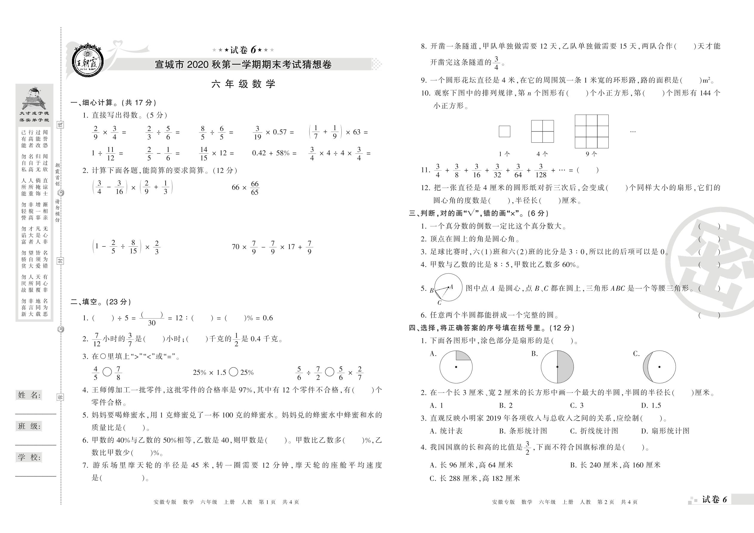 2019-2020学年第一学期宣城市六年级数学试卷(人教版)【6】
