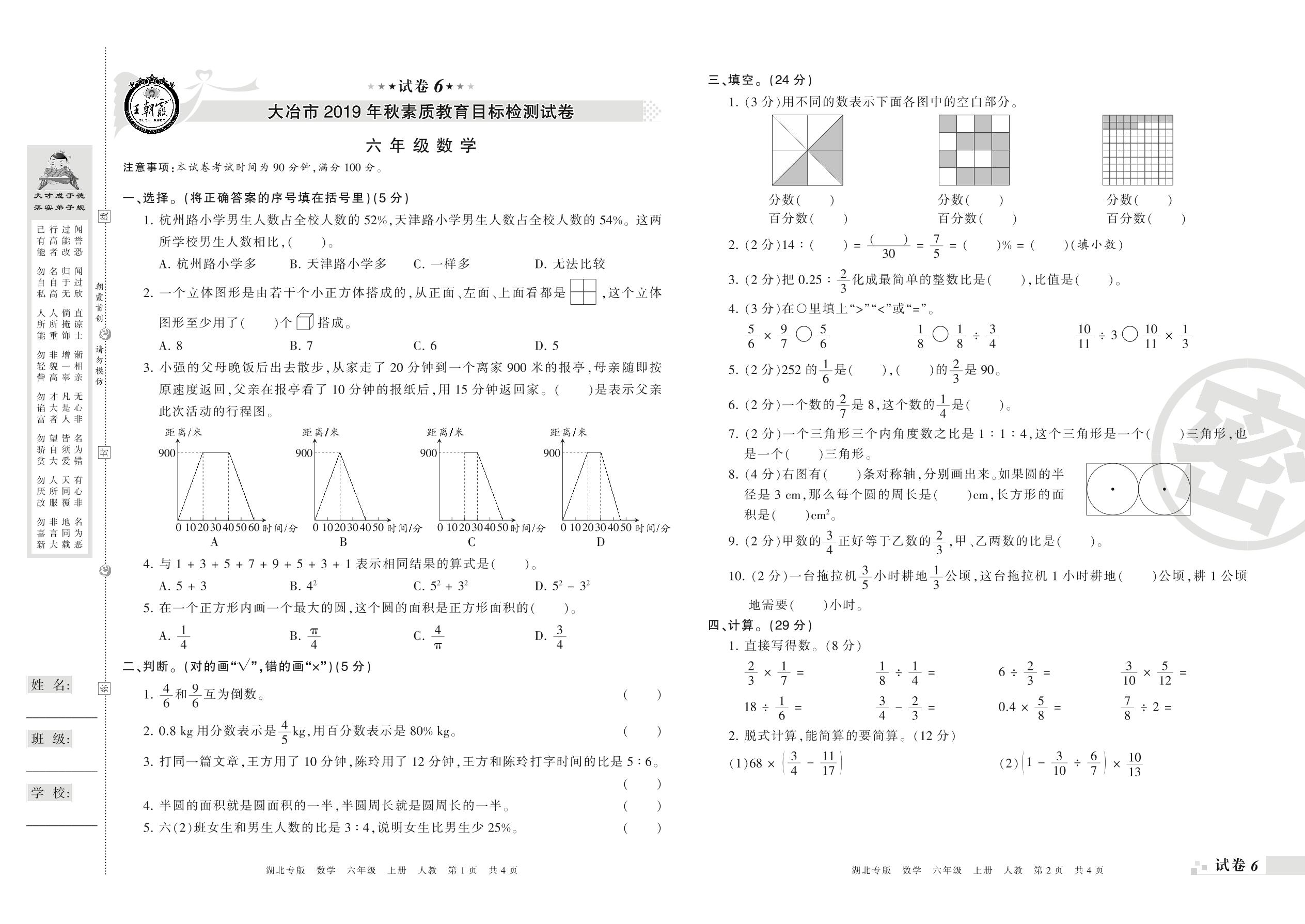 2019-2020学年第一学期大冶市六年级数学试卷(人教版)【6】