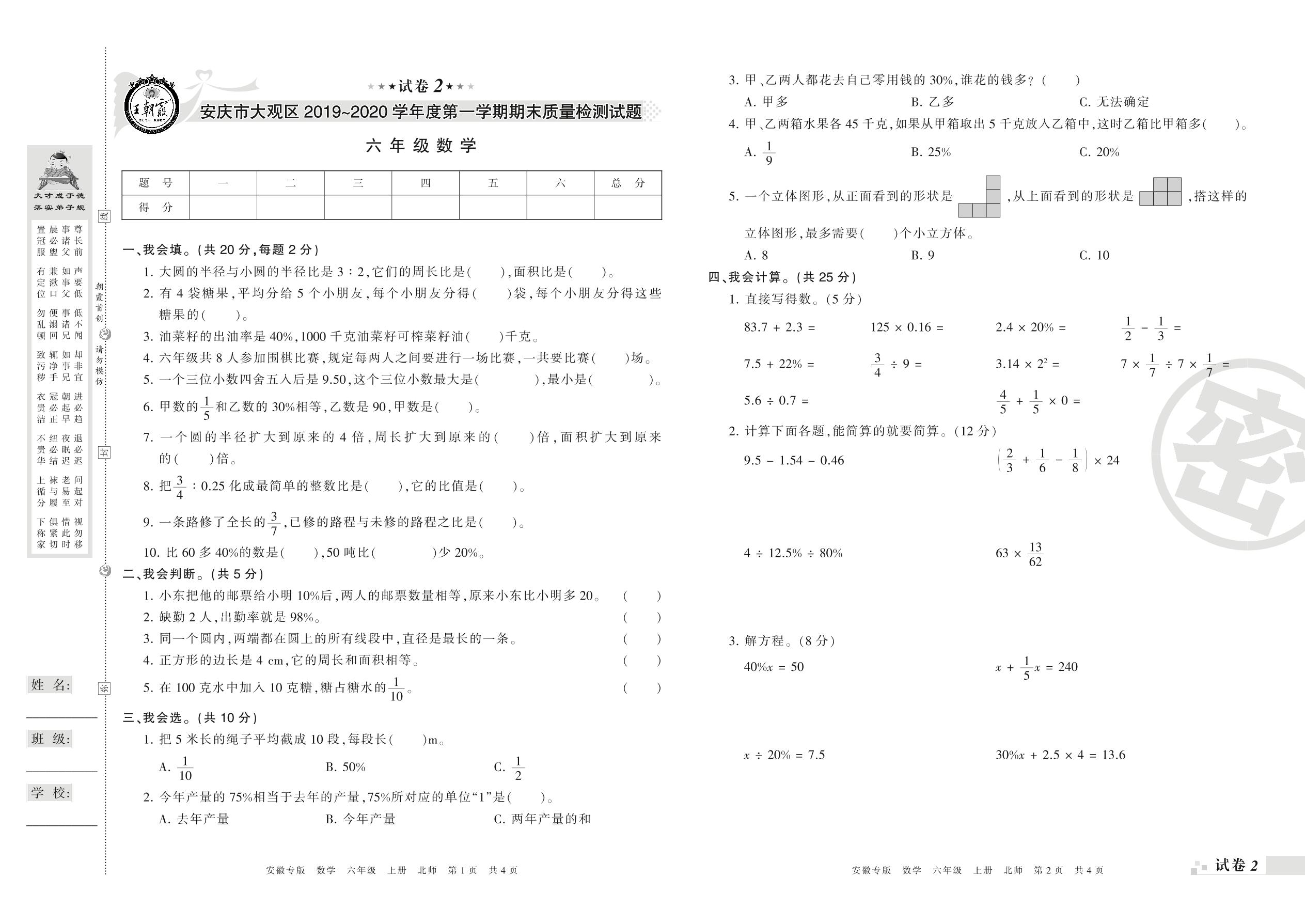 2019-2020学年第一学期安庆市大观区六年级数学试卷(北师版)【2】