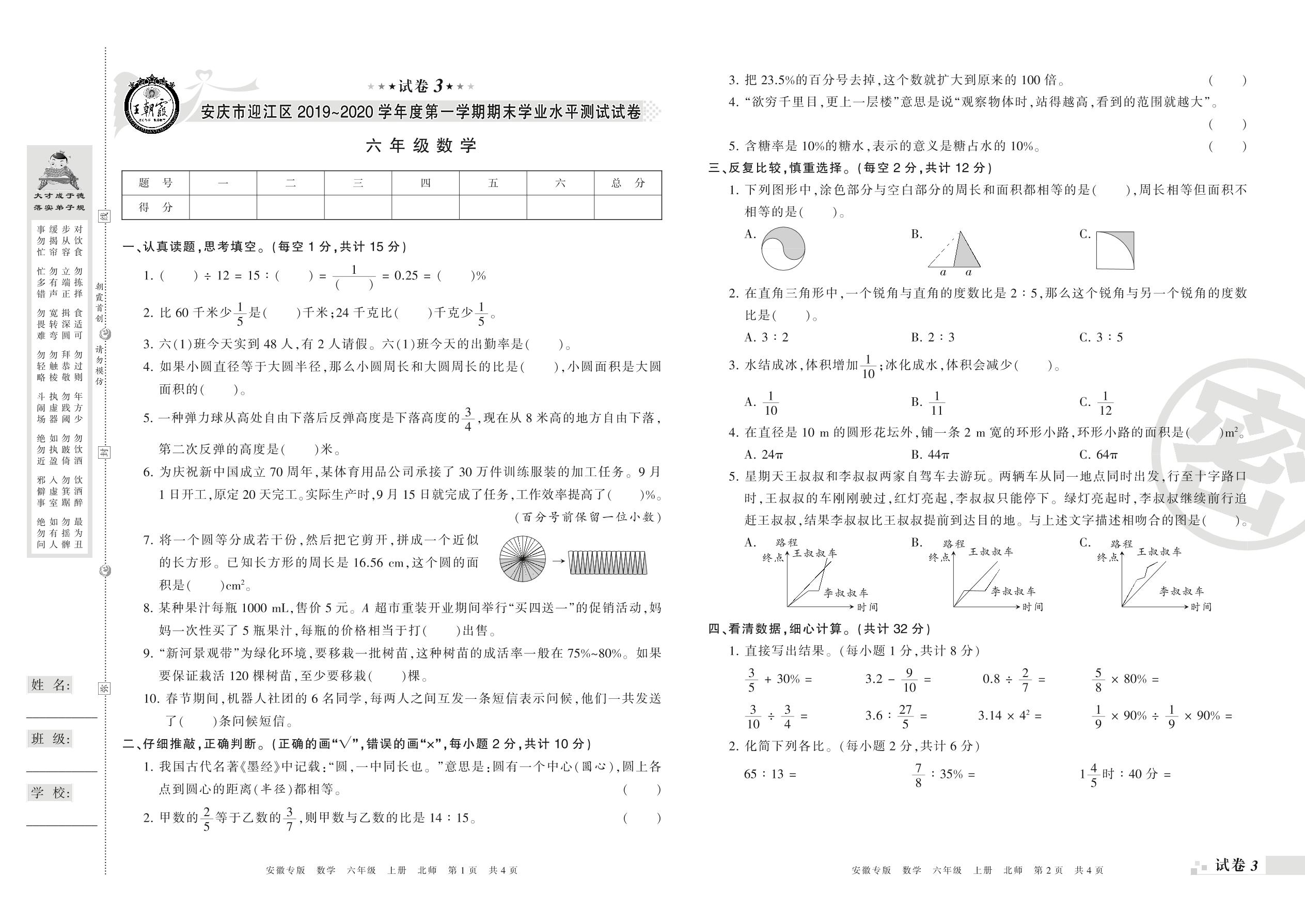 2019-2020学年第一学期安庆市迎江区六年级数学试卷(北师版)【3】