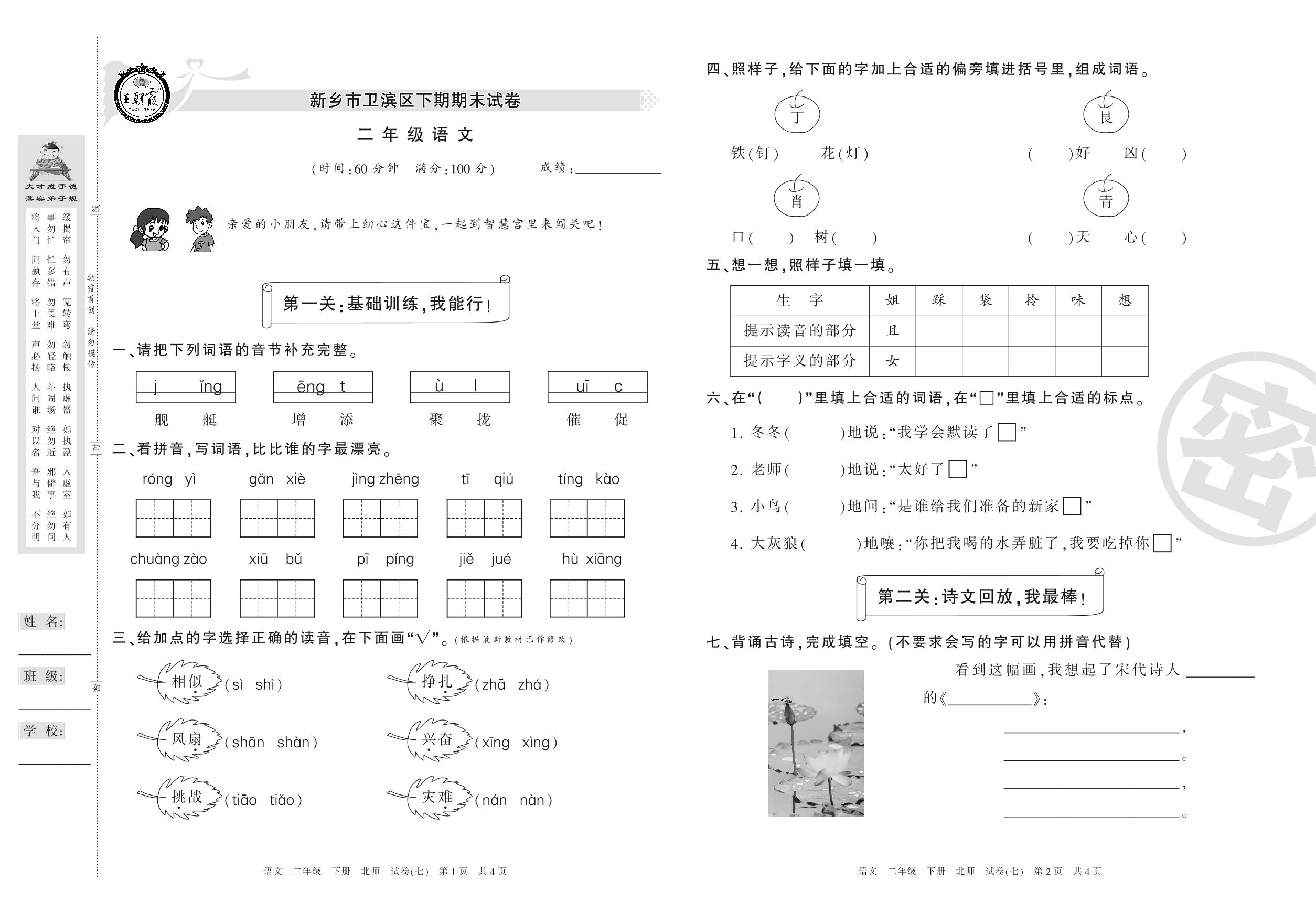 2015-2016学年第二学期新乡市卫滨区二年级语文试卷(北师版)【7】