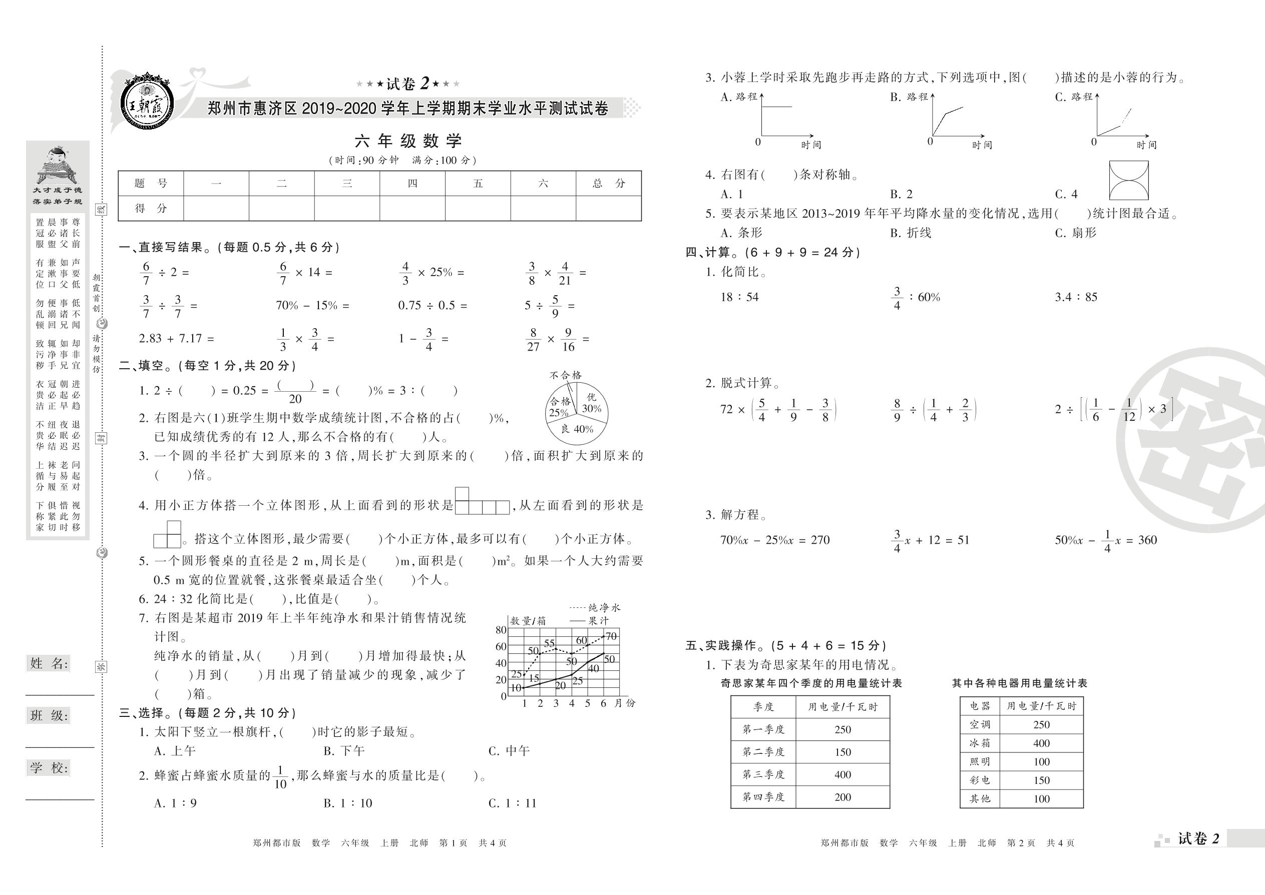 2019-2020学年第一学期郑州市惠济区六年级数学试卷(北师版)【2】