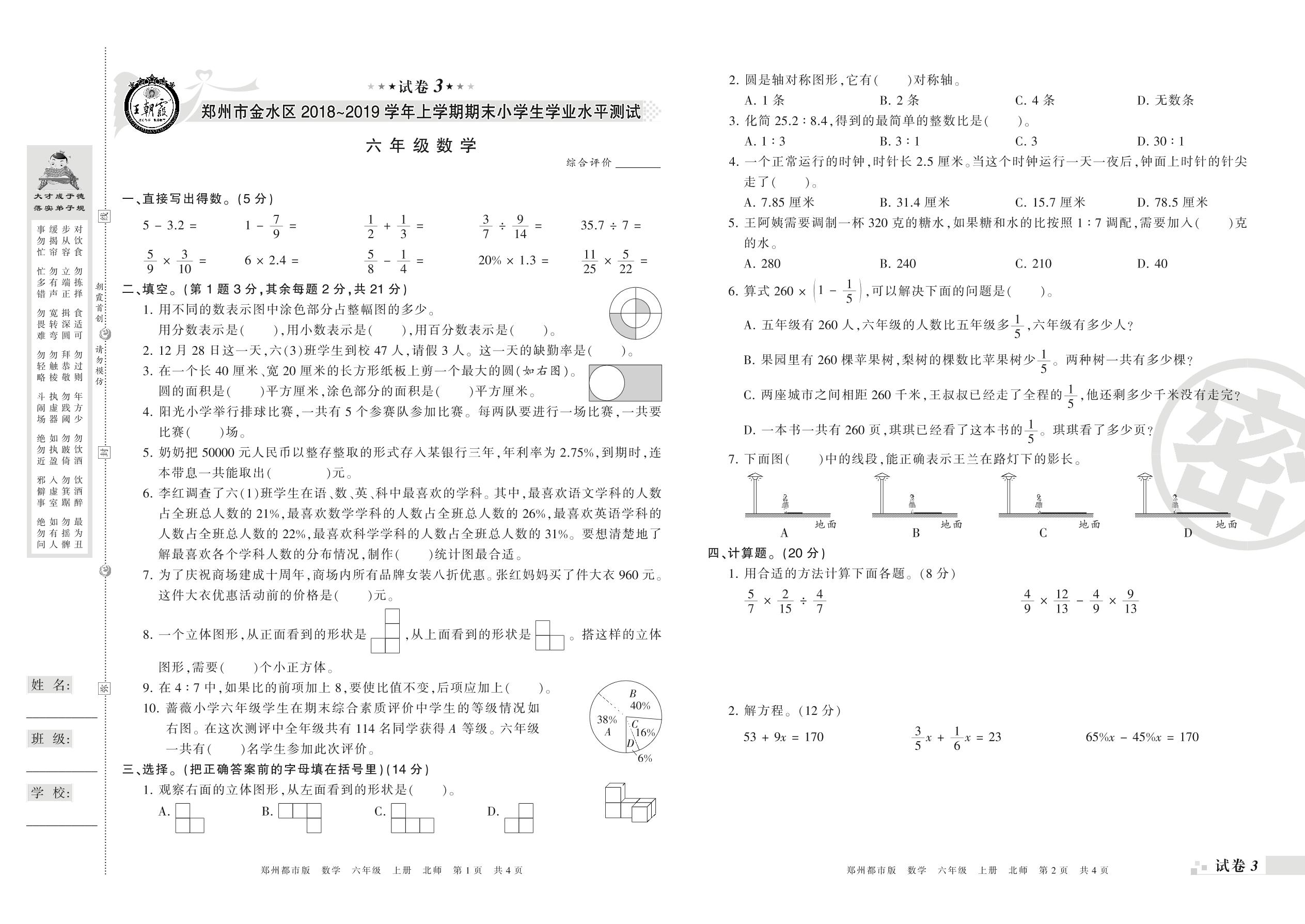 2018-2019学年第一学期郑州市金水区六年级数学试卷(北师版)【3】