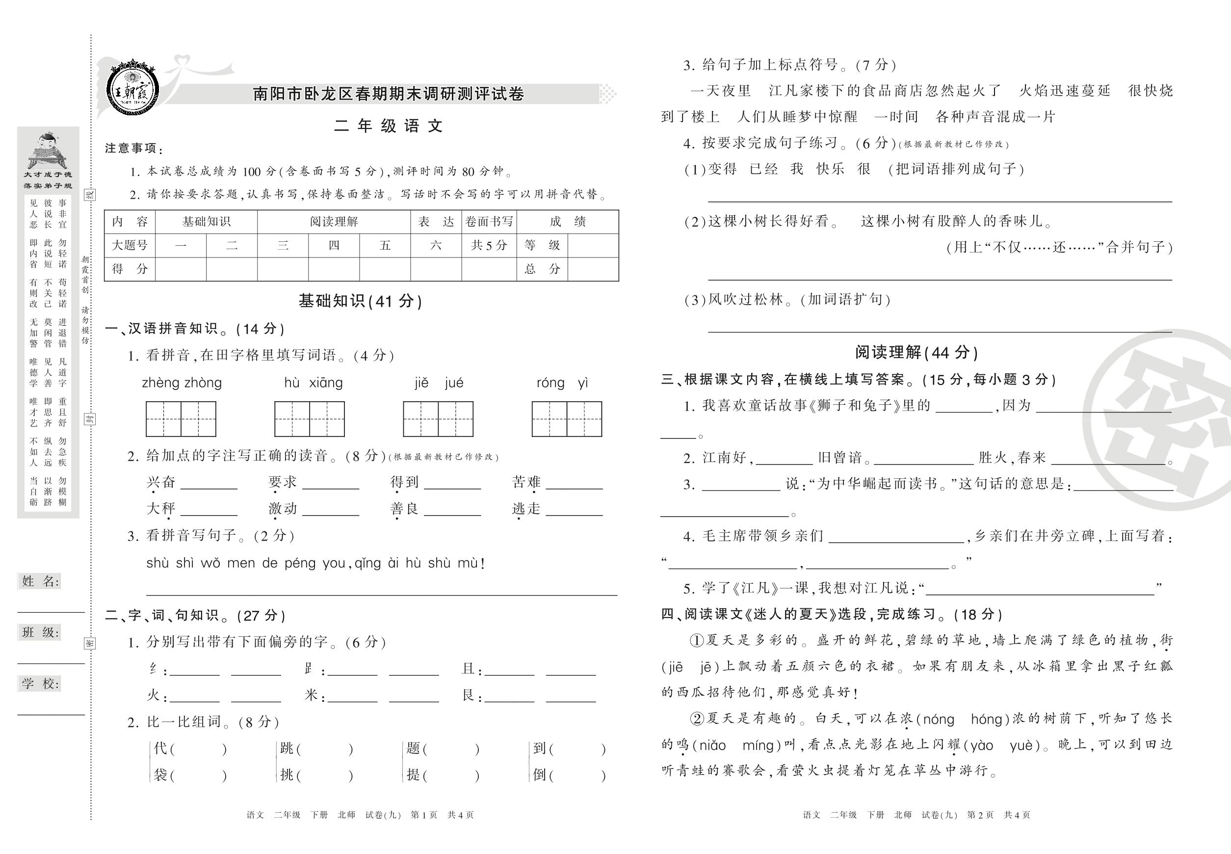 2015-2016学年第二学期南阳市卧龙区二年级语文试卷(北师版)【9】