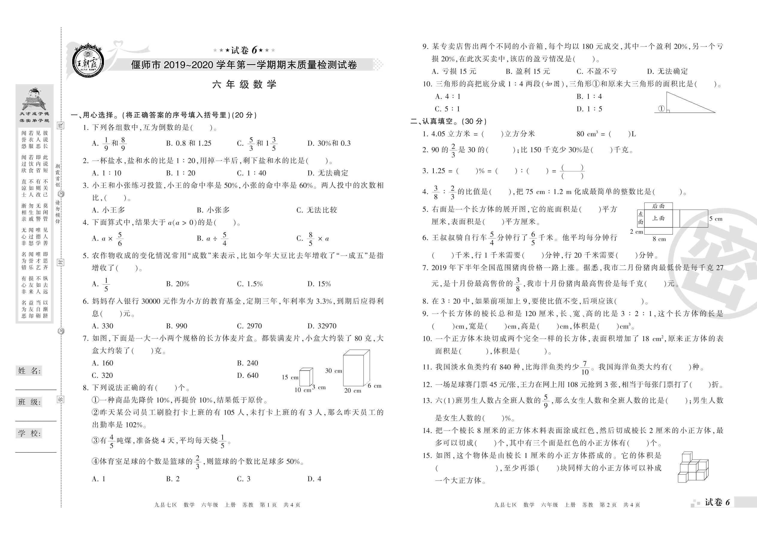 2019-2020学年第一学期偃师市六年级数学试卷(苏教版)【6】