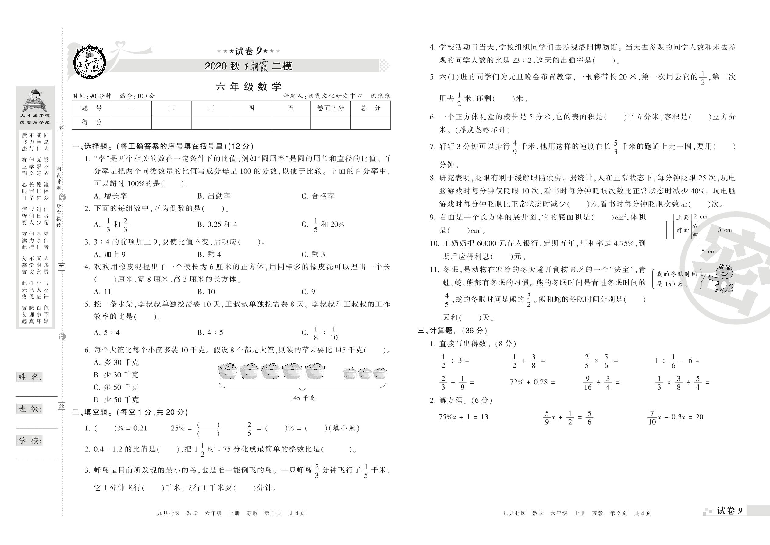 王朝霞期末模拟卷六年级上册数学(苏教版)_R21080592935【9】