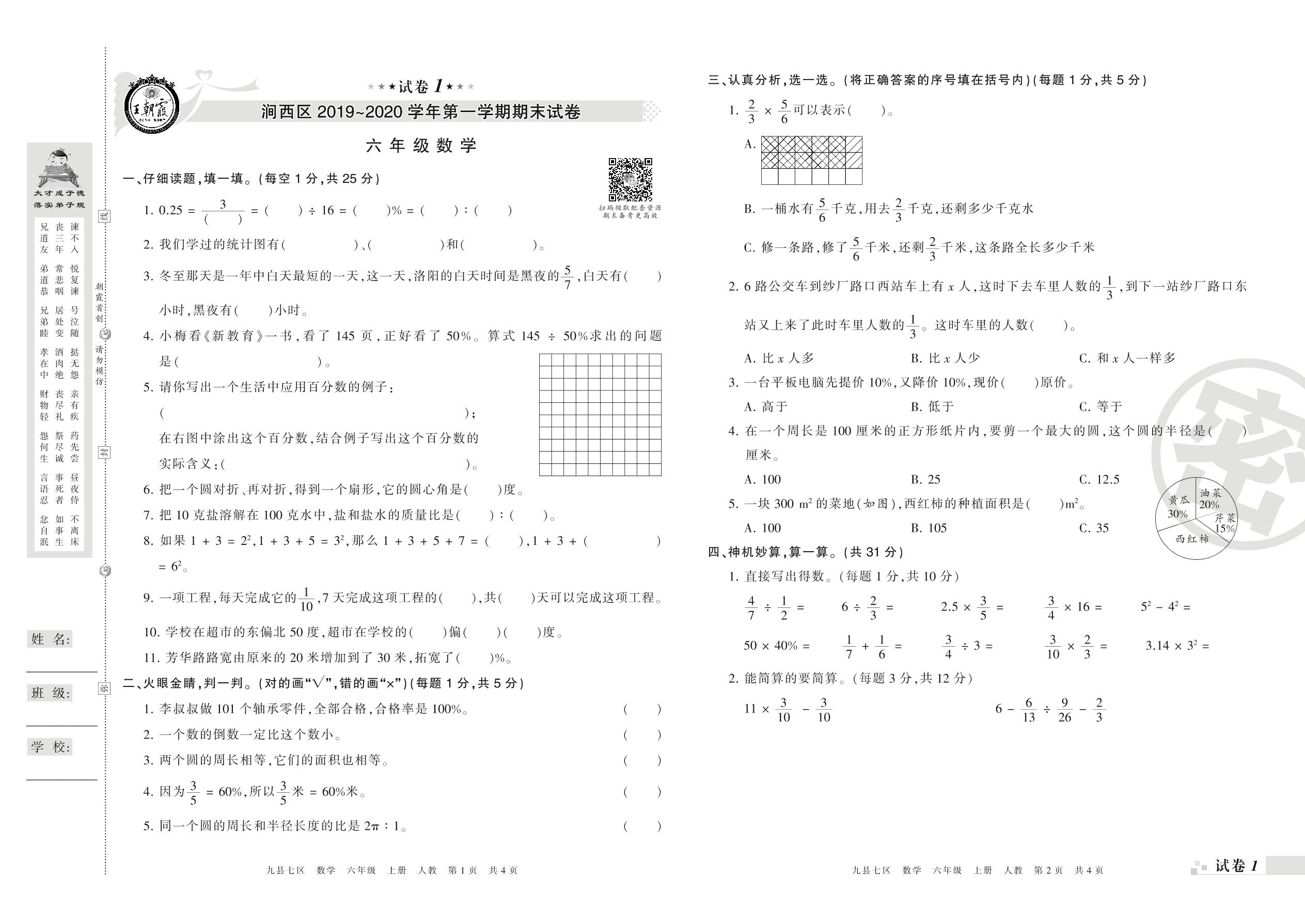 2019-2020学年第一学期洛阳市涧西区六年级数学试卷(人教版)【1】