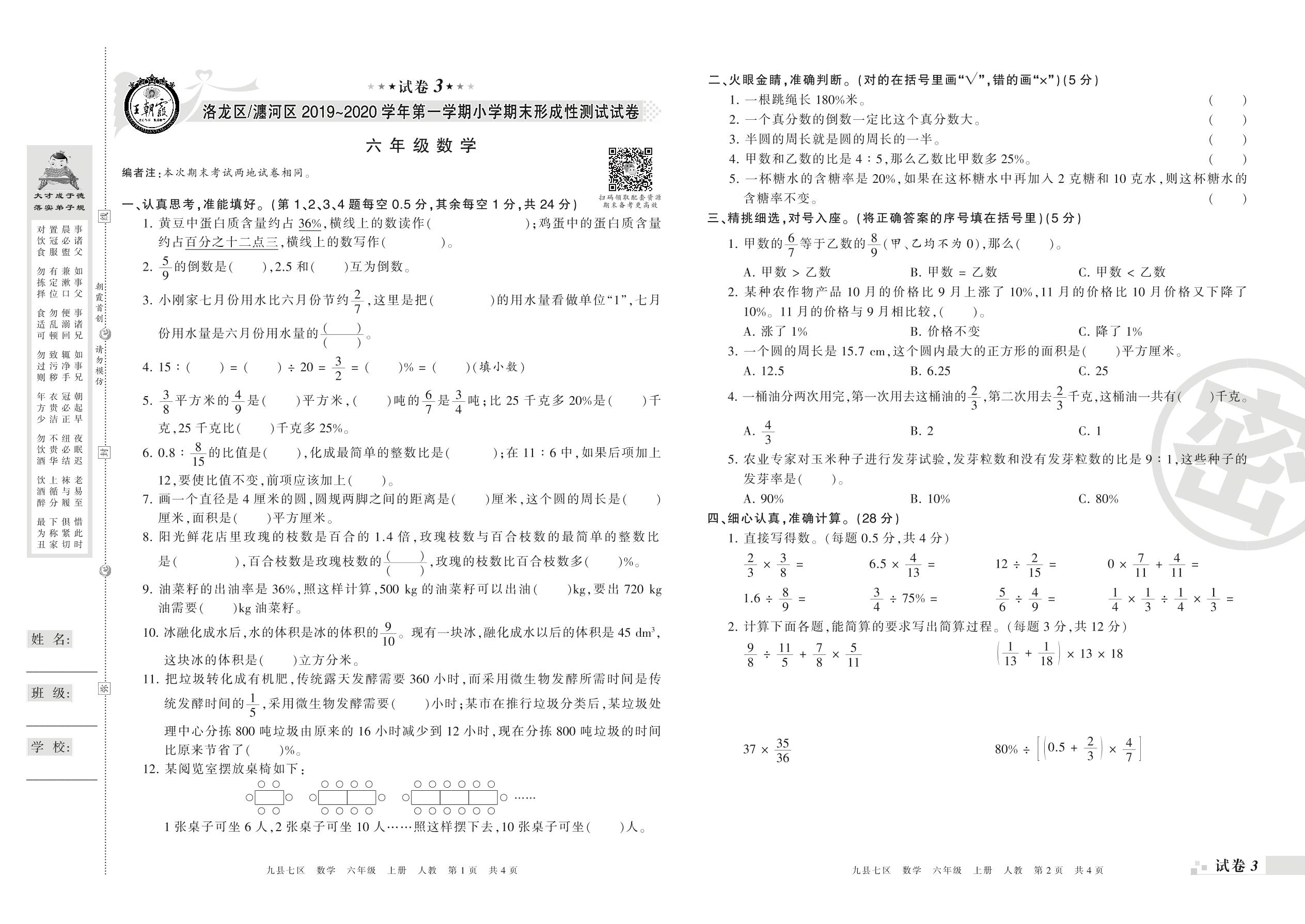 2019-2020学年第一学期洛阳市洛龙区、瀍河区六年级数学试卷(人教版)【3】