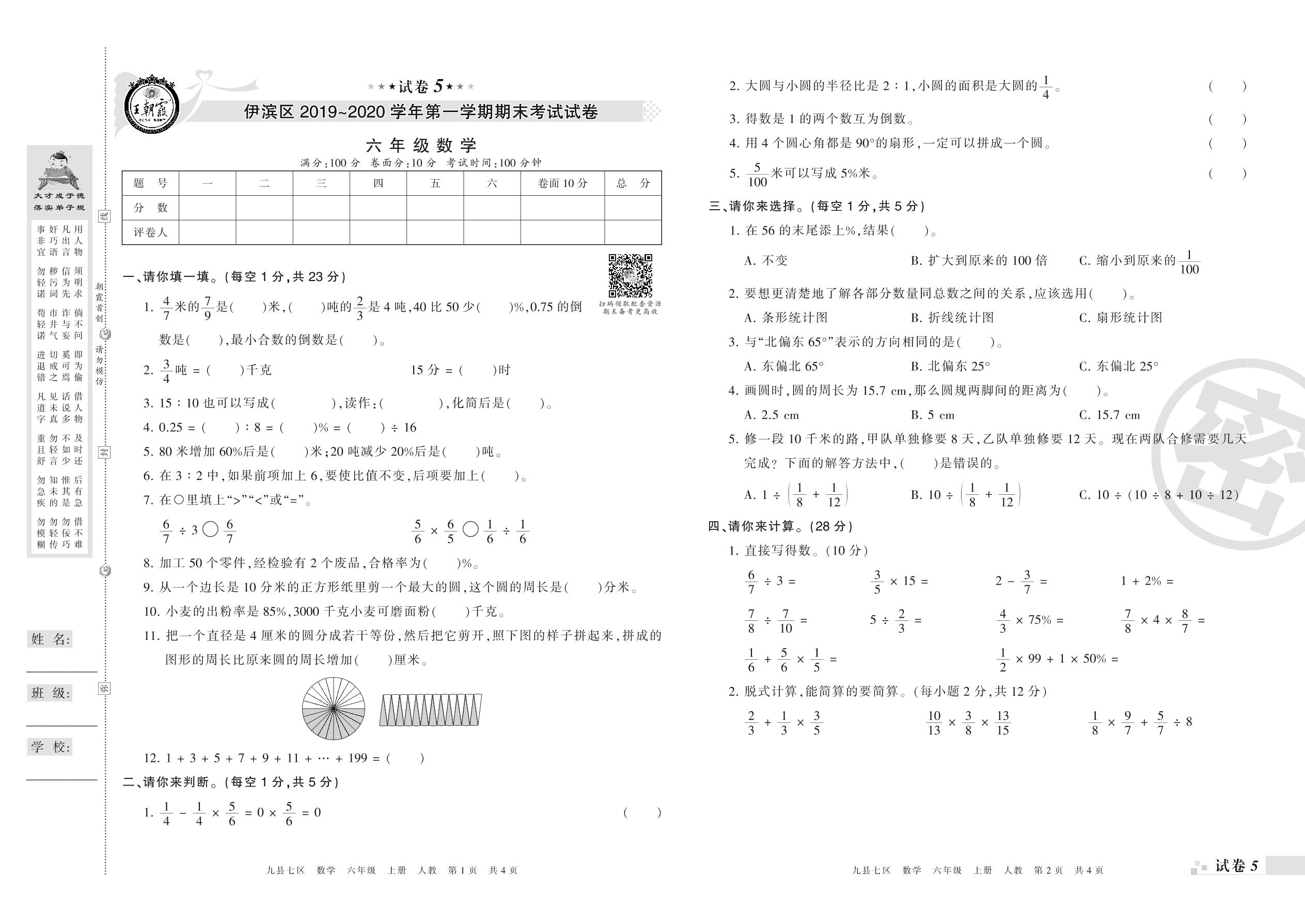 2019-2020学年第一学期洛阳市伊滨区六年级数学试卷(人教版)【5】