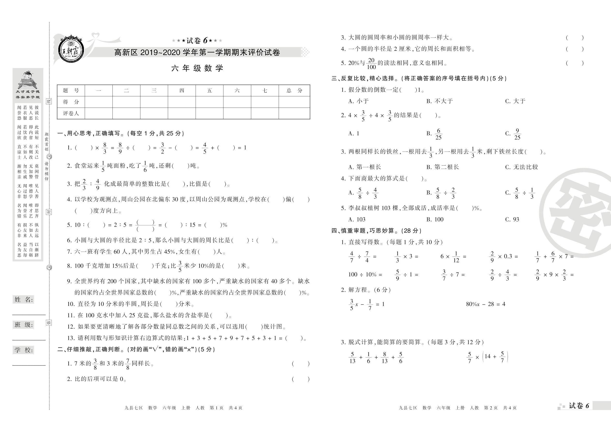 2019-2020学年第一学期洛阳市高新区六年级数学试卷(人教版)【6】