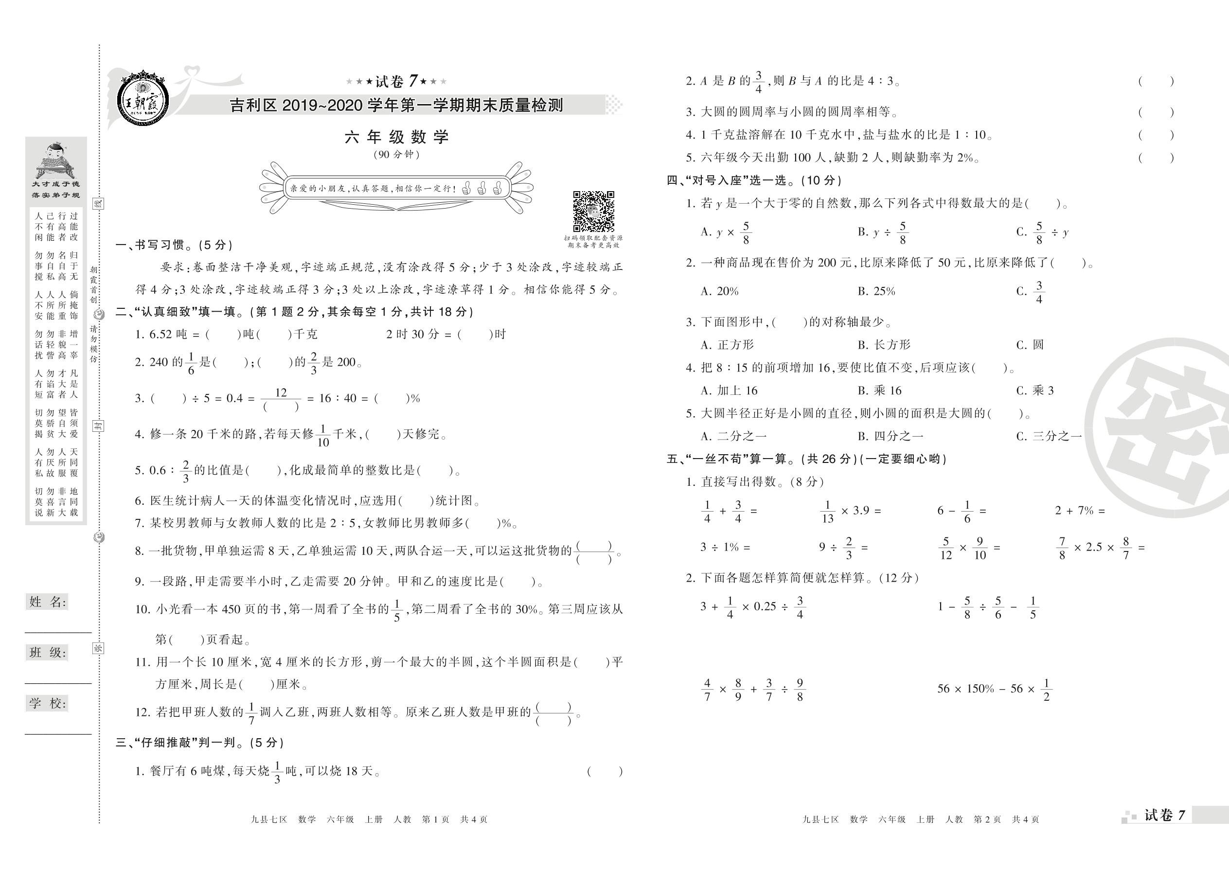2019-2020学年第一学期洛阳市吉利区六年级数学试卷(人教版)【7】