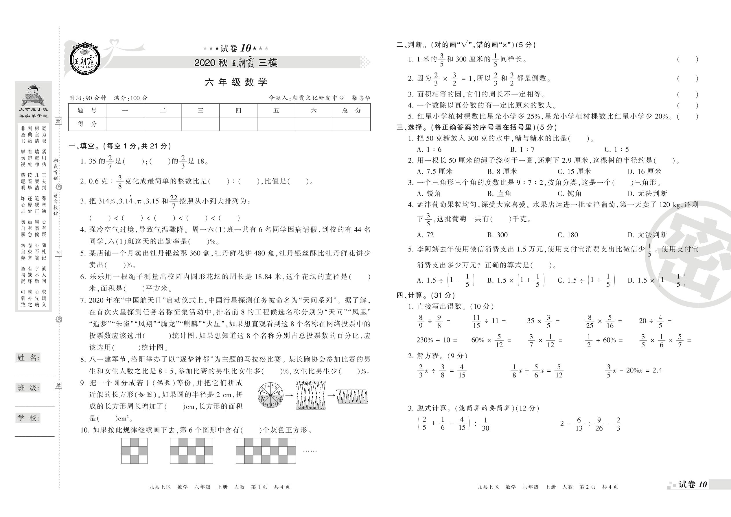 王朝霞期末模拟卷六年级上册数学(人教版)【10】
