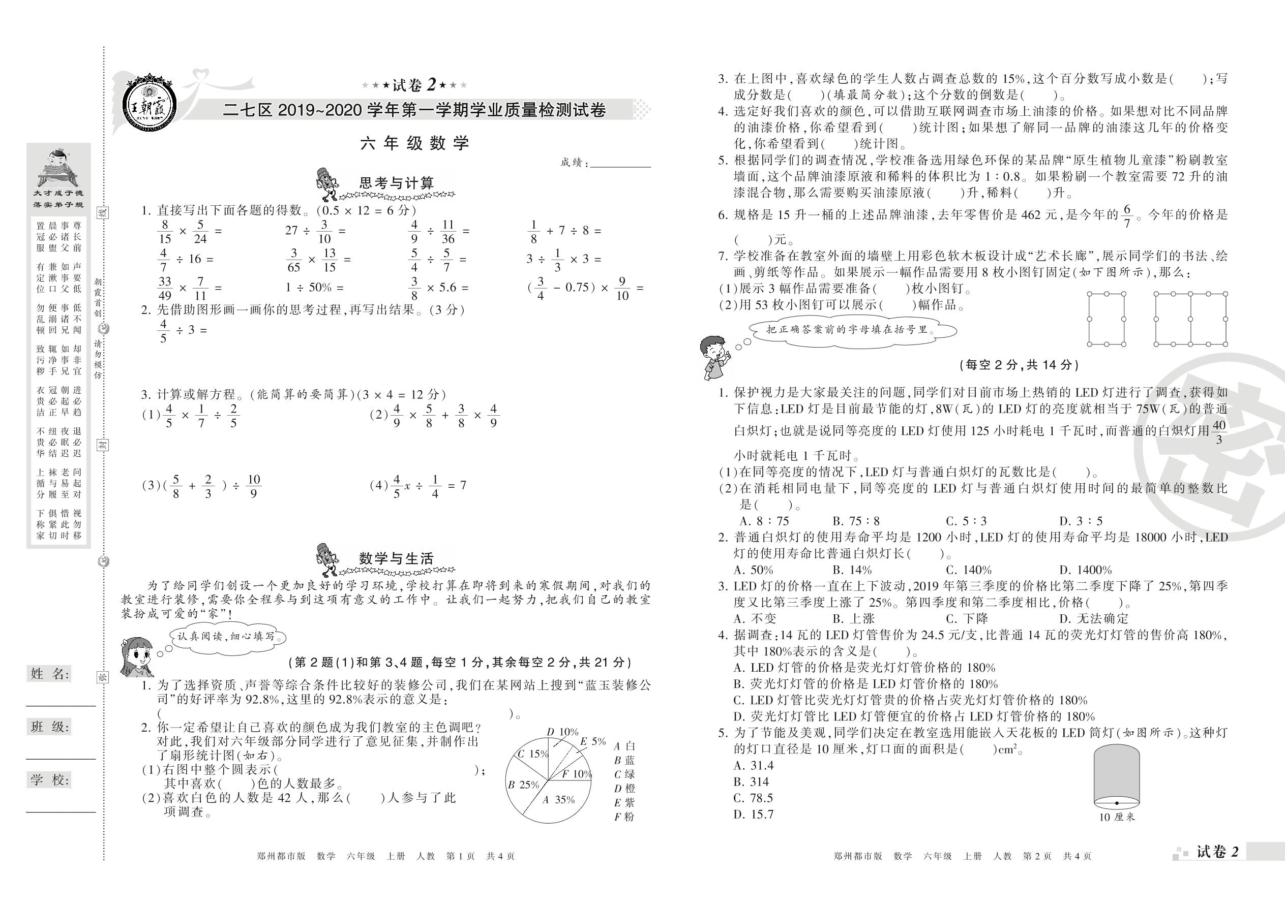 2019-2020学年第一学期郑州市二七区六年级数学试卷(人教版)【2】