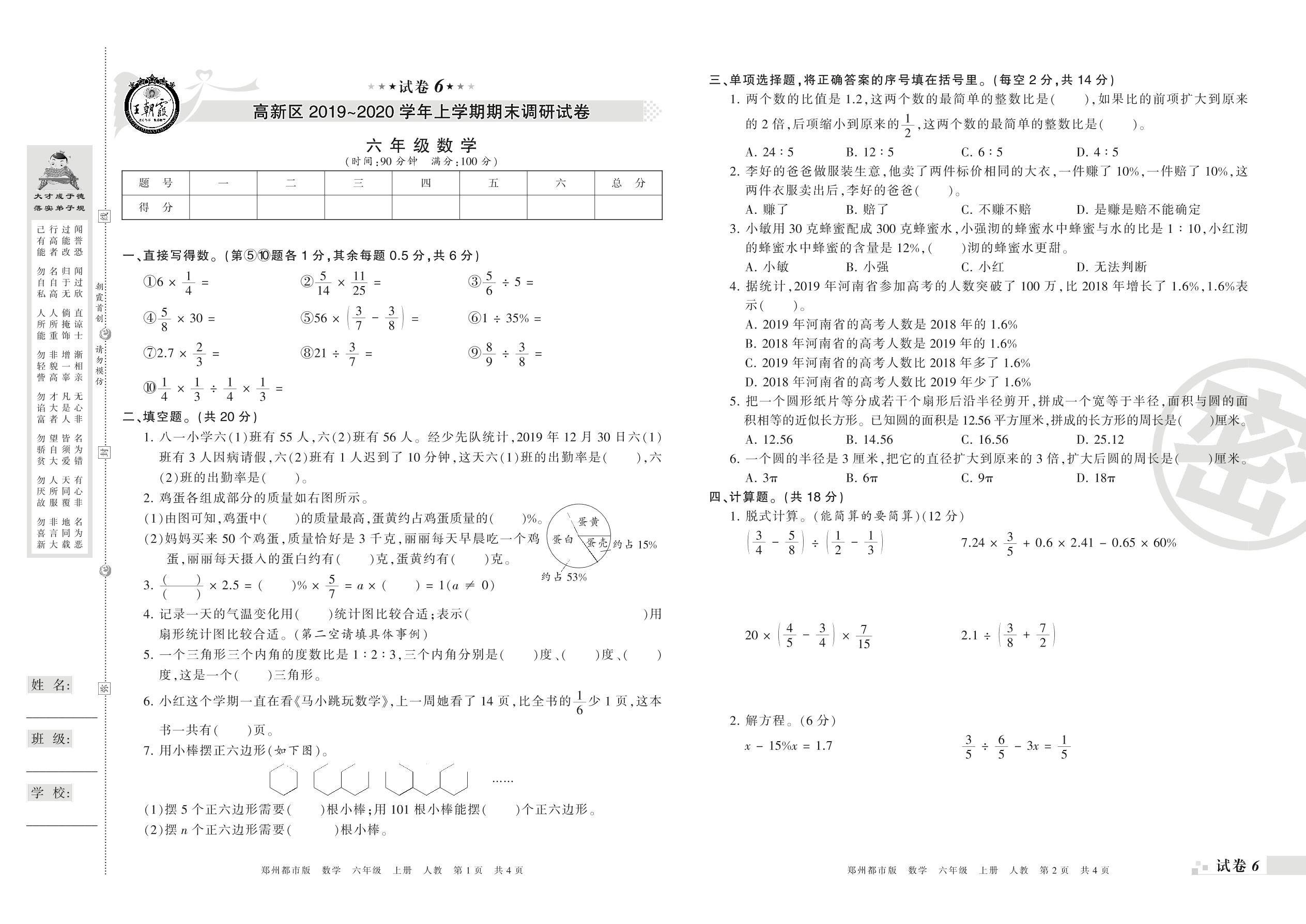 2019-2020学年第一学期郑州市高新区六年级数学试卷(人教版)【6】