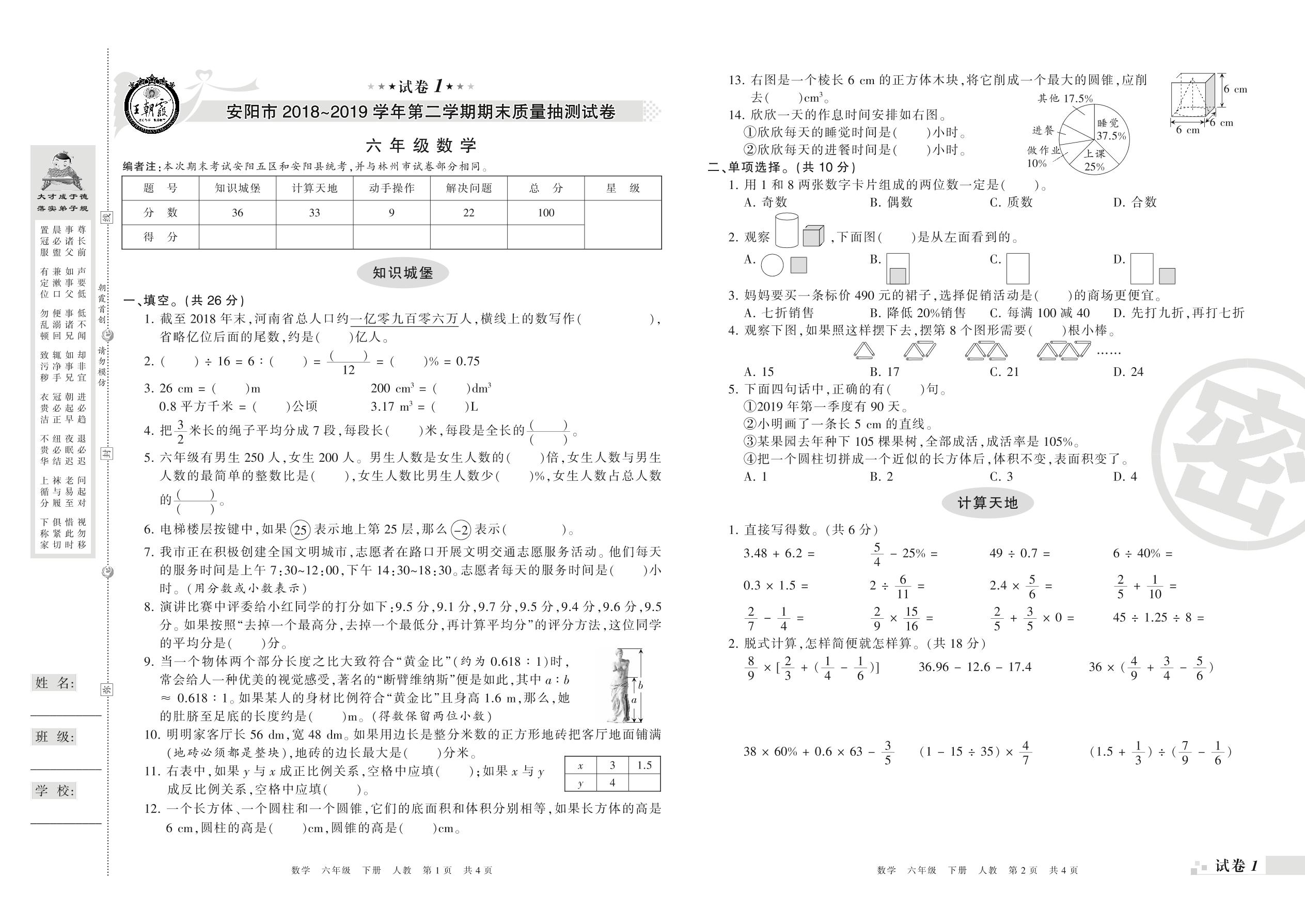 2018-2019学年第二学期安阳市六年级数学试卷(人教版)【1】