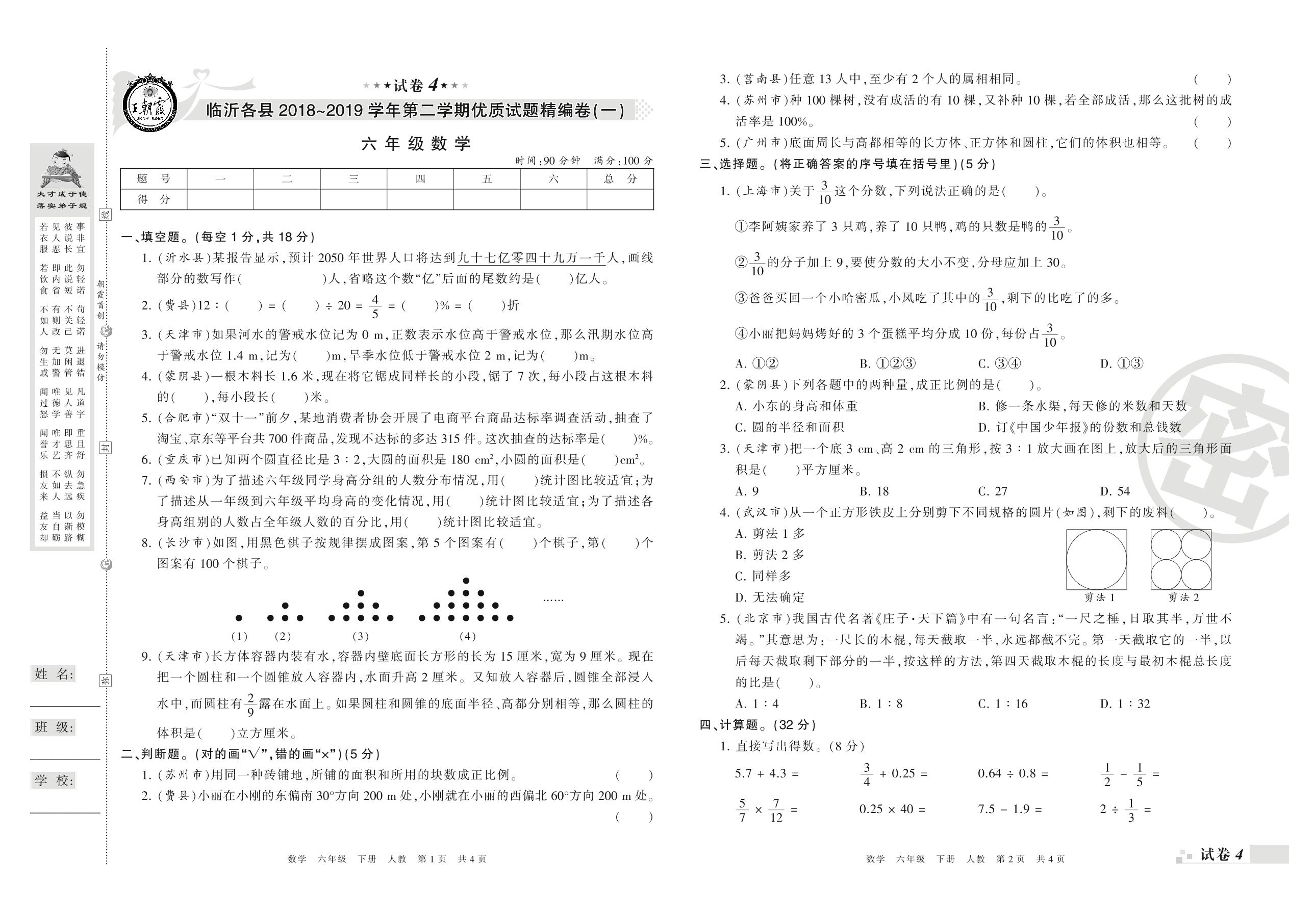 临沂各县优质试题精编卷(一)六年级下册数学(人教版)【4】