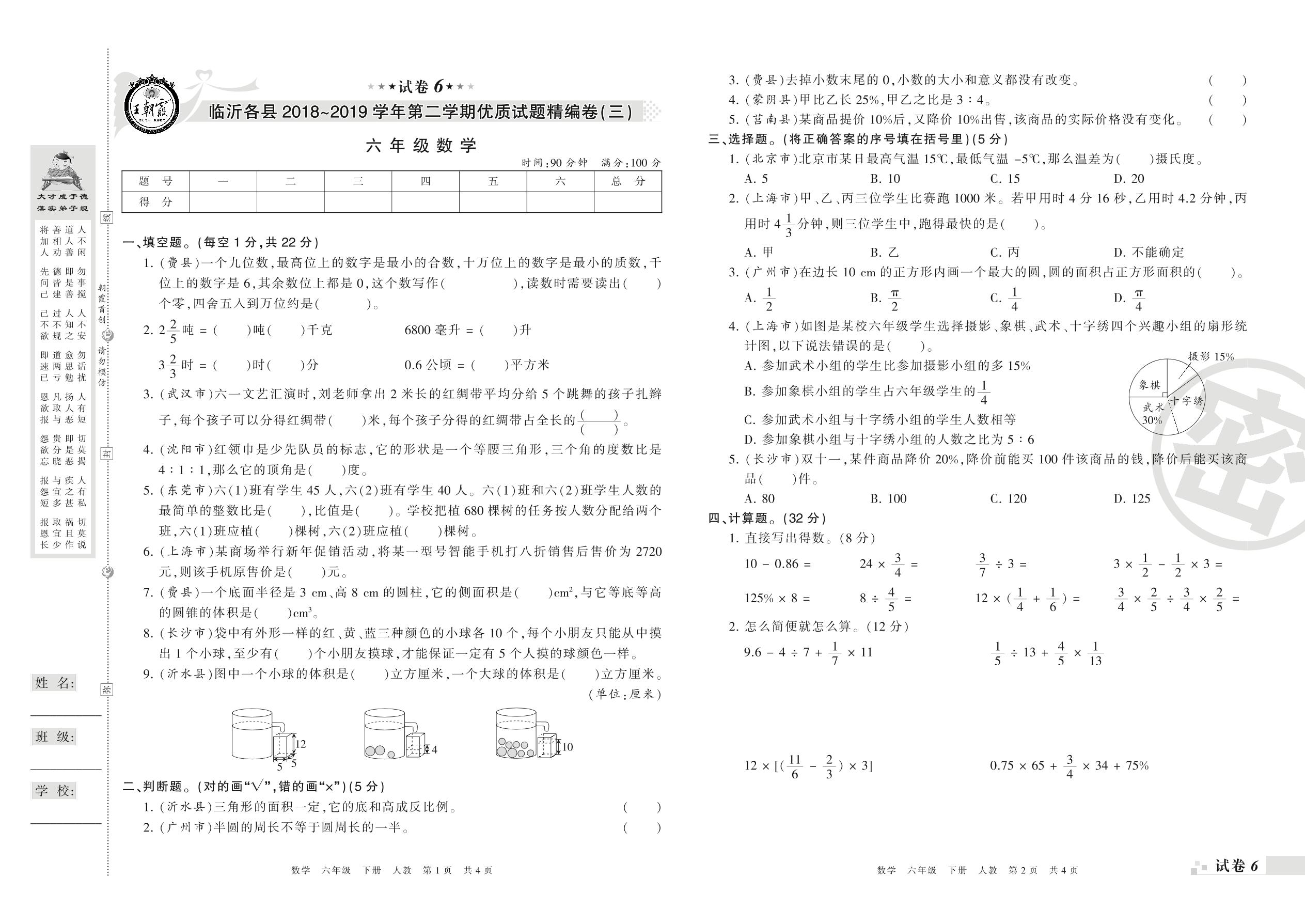 临沂各县优质试题精编卷(三)六年级下册数学(人教版)【6】