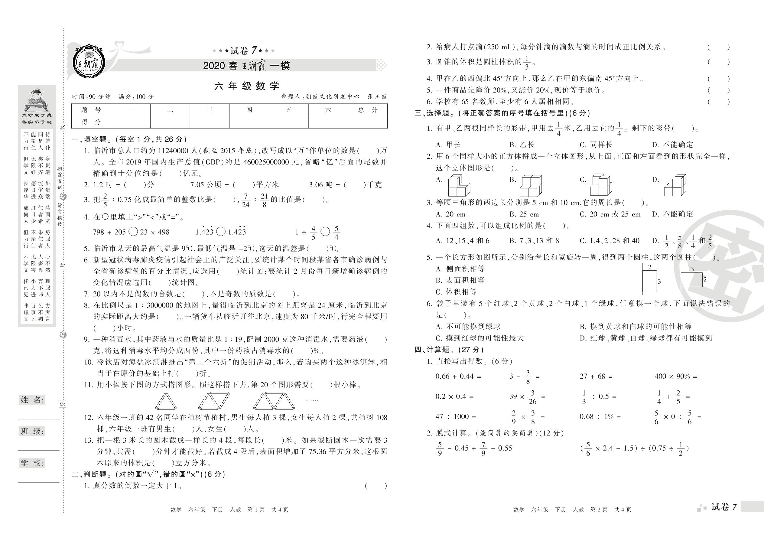 王朝霞期末模拟卷六年级下册数学(人教版)_R21080593250【7】